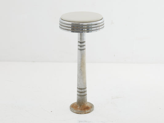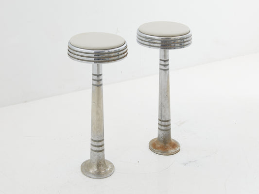Pair of Art Deco Counter Stools, 1960sSit back and enjoy the ride on this fabulous swivel stool. With its cream naugahyde seat and chrome base, it's not just a seat but a statement piece. Get ready to swivel, sass, and make a stylish impression in any room! - 29.5"h, 13"dia- Steel, grey vinyl-...
