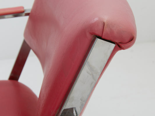 Chrome & Pink Vinyl Chair by Cal-Style, 1980sWith its shiny chrome frame and vibrant pink vinyl upholstery, this Cal-Style chair is the epitome of retro chic. Sit back, relax, and let the coolness wash over you as you channel your inner 70s superstar. - 31"h, 22.5"w, 22"d, 17.75"h (seat height), 25.25"h...