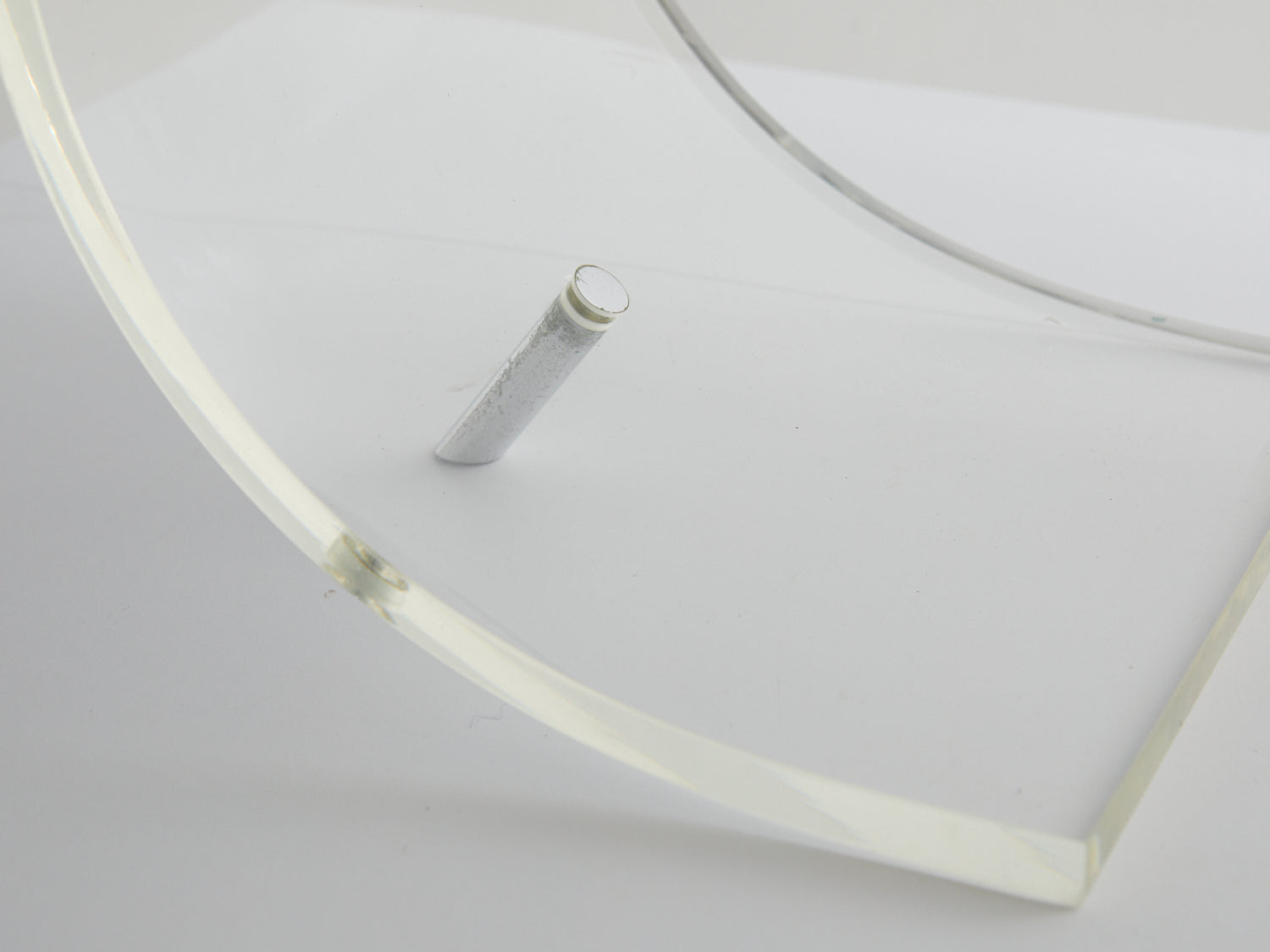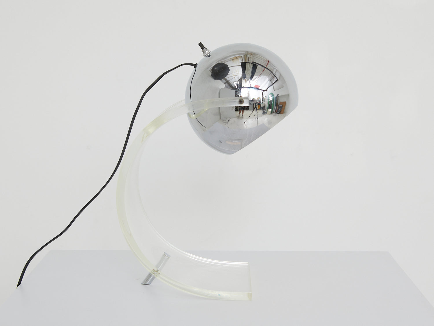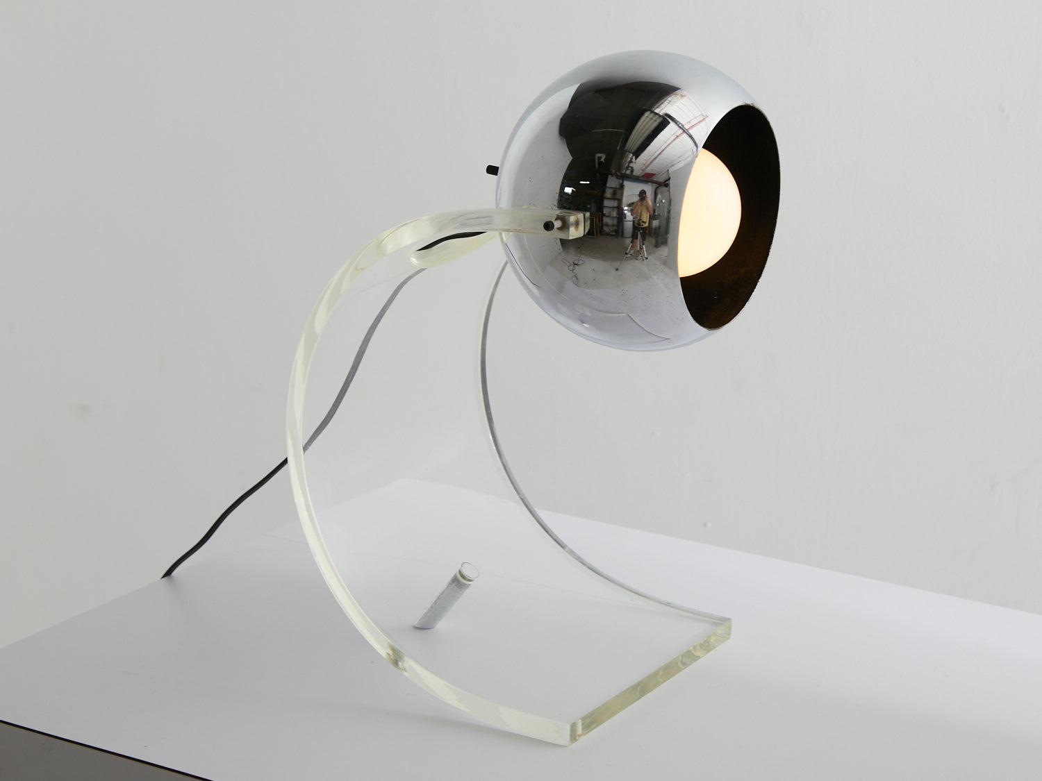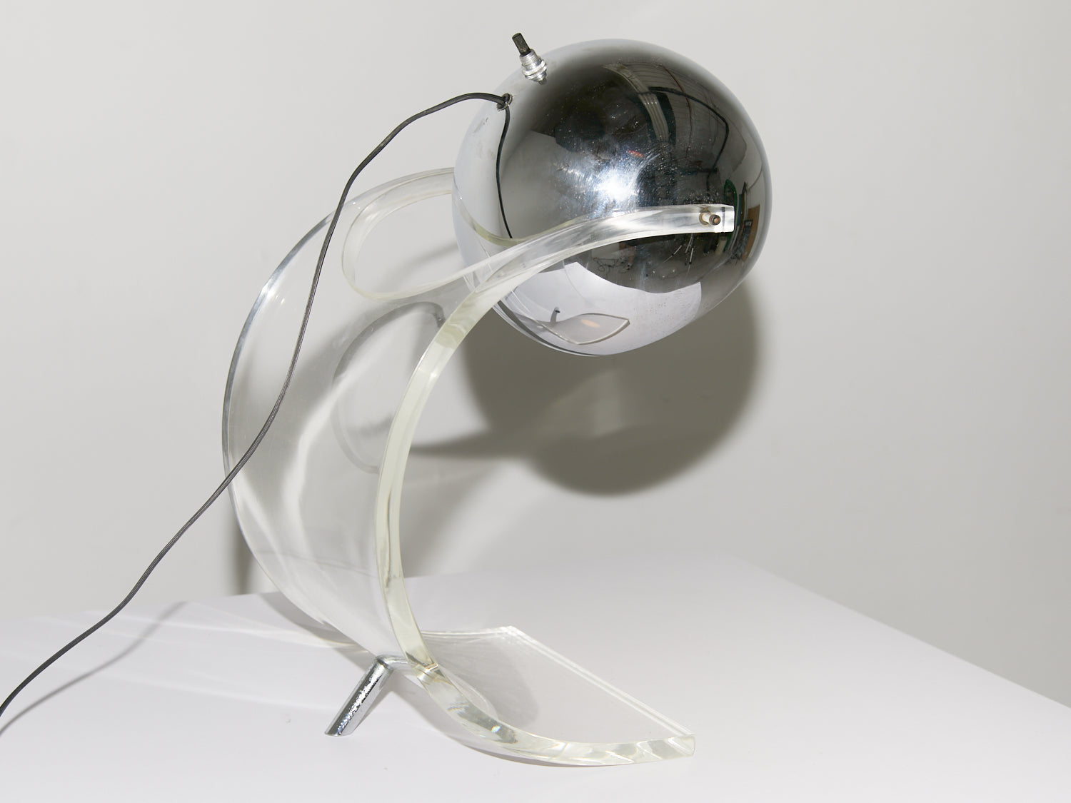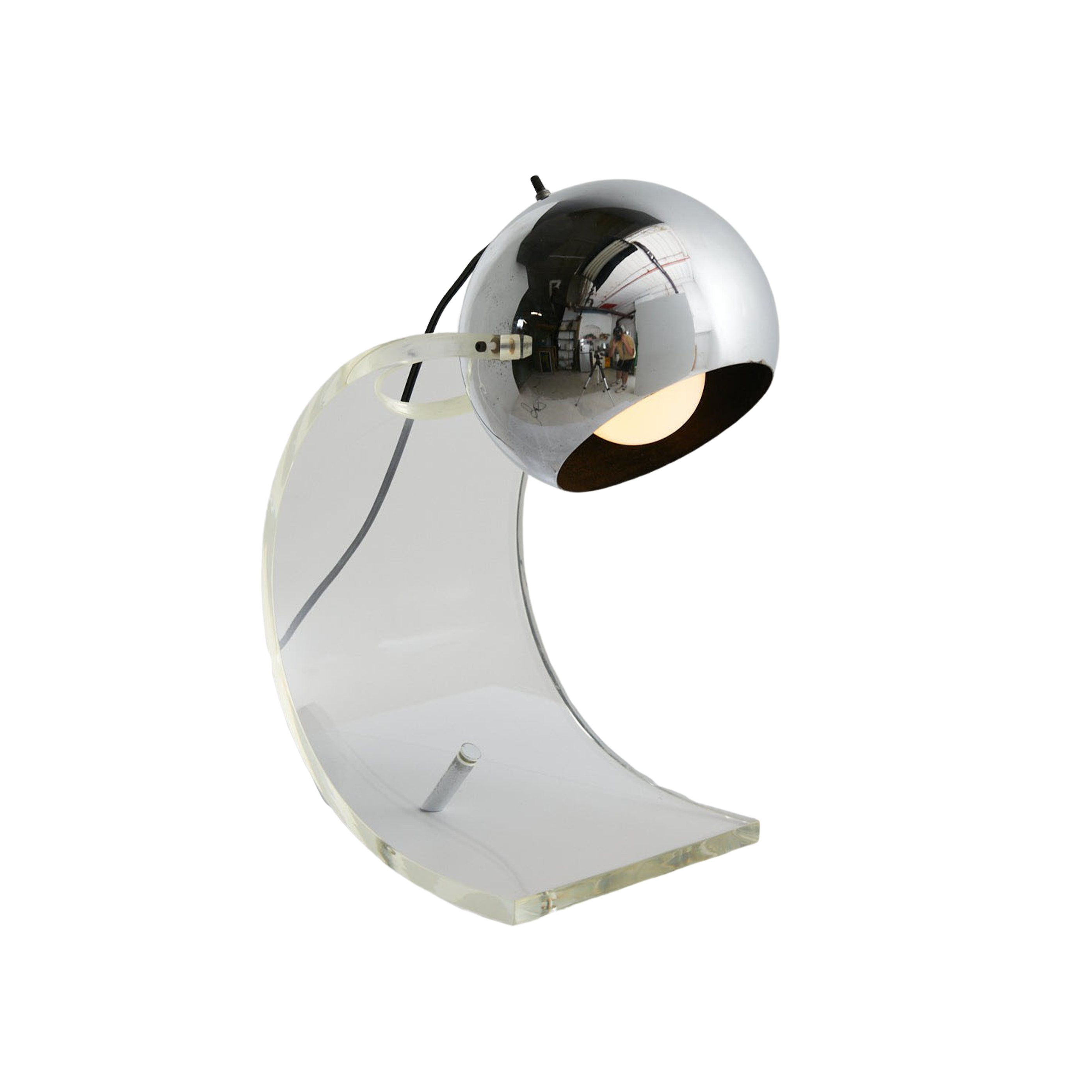 Add a dash of whimsy to your tabletop with this lamp that knows how to have fun. Its curvy silhouette and glossy chrome details create a lighthearted vibe, while the Lucite body adds a touch of modern cool. It's the ideal companion for those who appreciate a playful twist in their lighting.