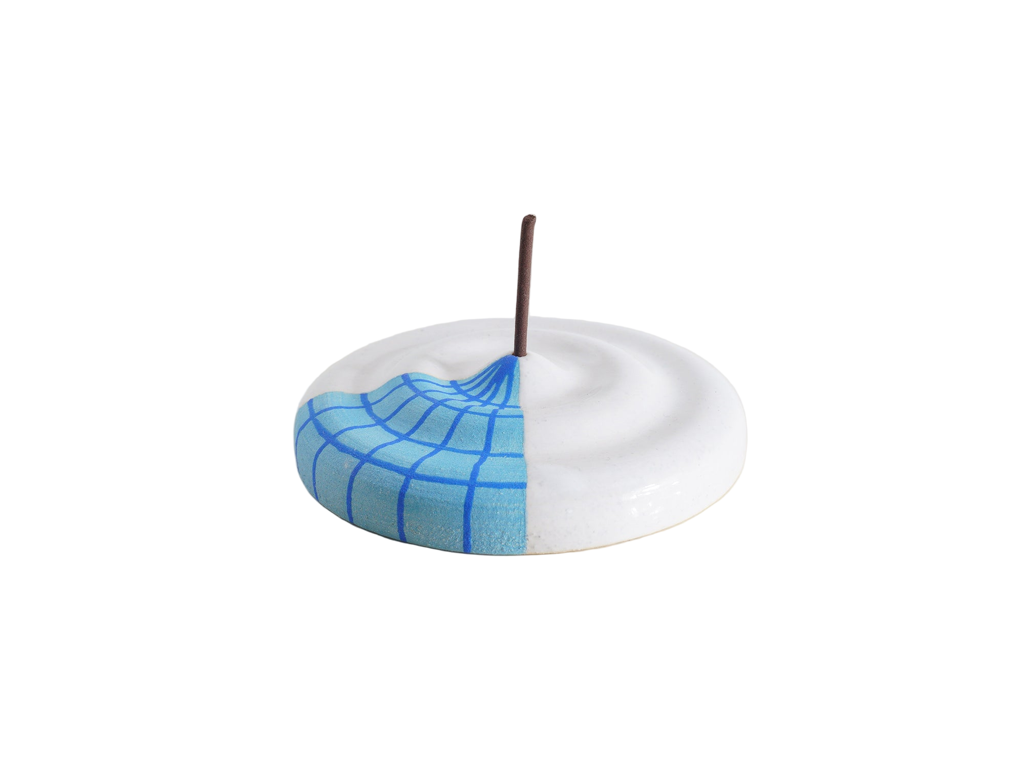 - Hand-thrown off-white stoneware incense holder with hand-painted blue design