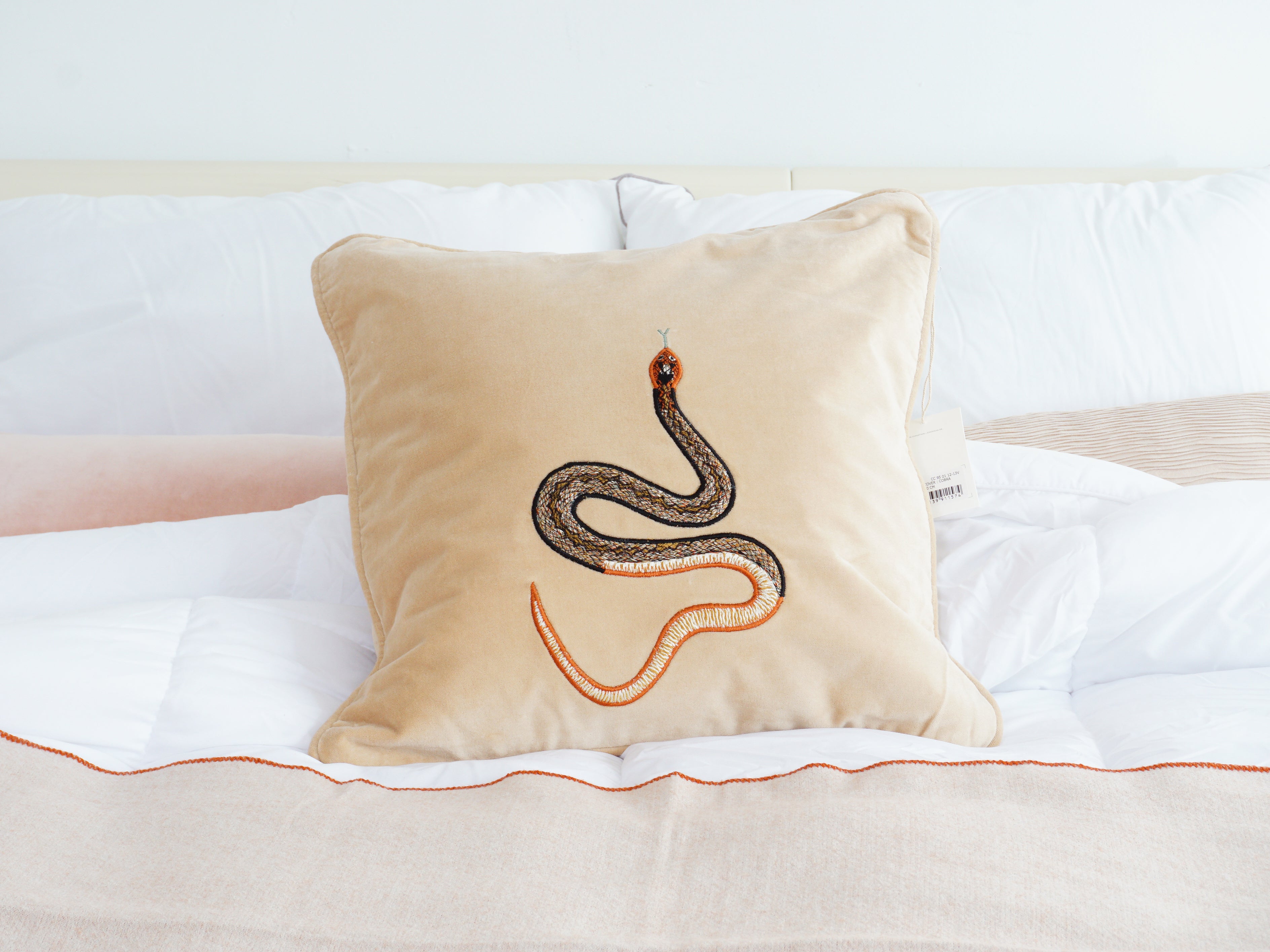 This velvet pillow isn't just for lounging—it's a chic statement piece. With an embroidered cobra that adds a touch of daring charm, it promises cozy nights with a dash of intrigue.