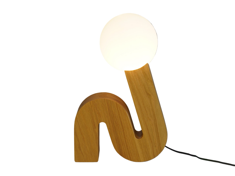 Mimicking a sit-up position, the Curl lamp nests a spherical glass shade into a curved wooden base to resemble a head and body mid-exercise.