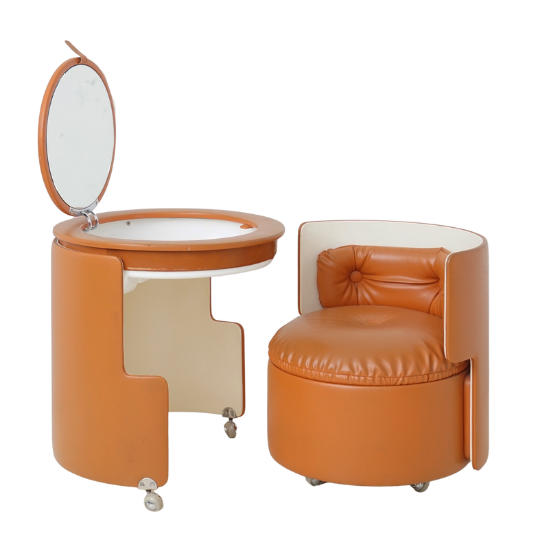 A rare and iconic piece of Italian modern design, the Dilly Dilly vanity by Luigi Massoni for Poltrona Frau combines sculptural form with compact function. Designed in the 1960s, it features a rotating cylindrical base that opens to reveal a vanity with a flip-top mirror and integrated storage, plus a matching upholstered chair that nests seamlessly inside.