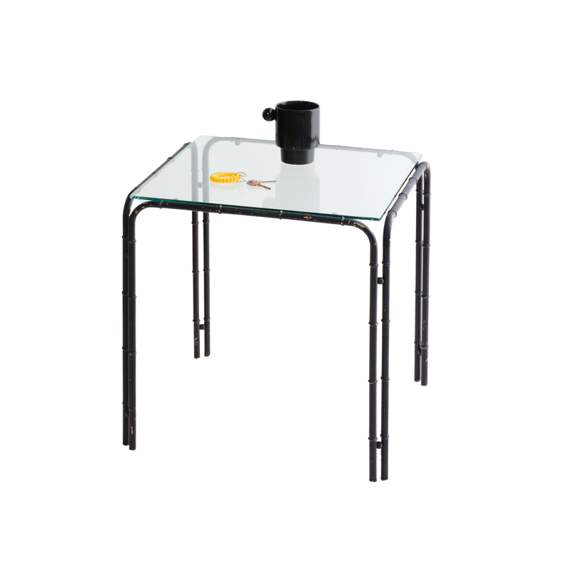 A faux-bamboo black painted metal beauty with an inset glass top that's as sleek as it is industrious.