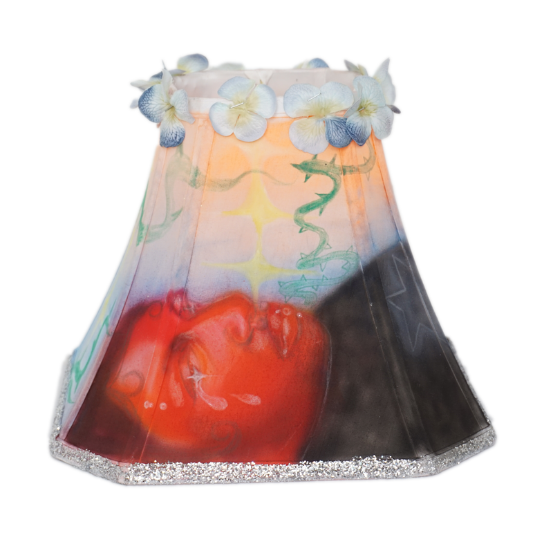 - Acrylic, glitter, and found fabric flowers on vintage lampshade