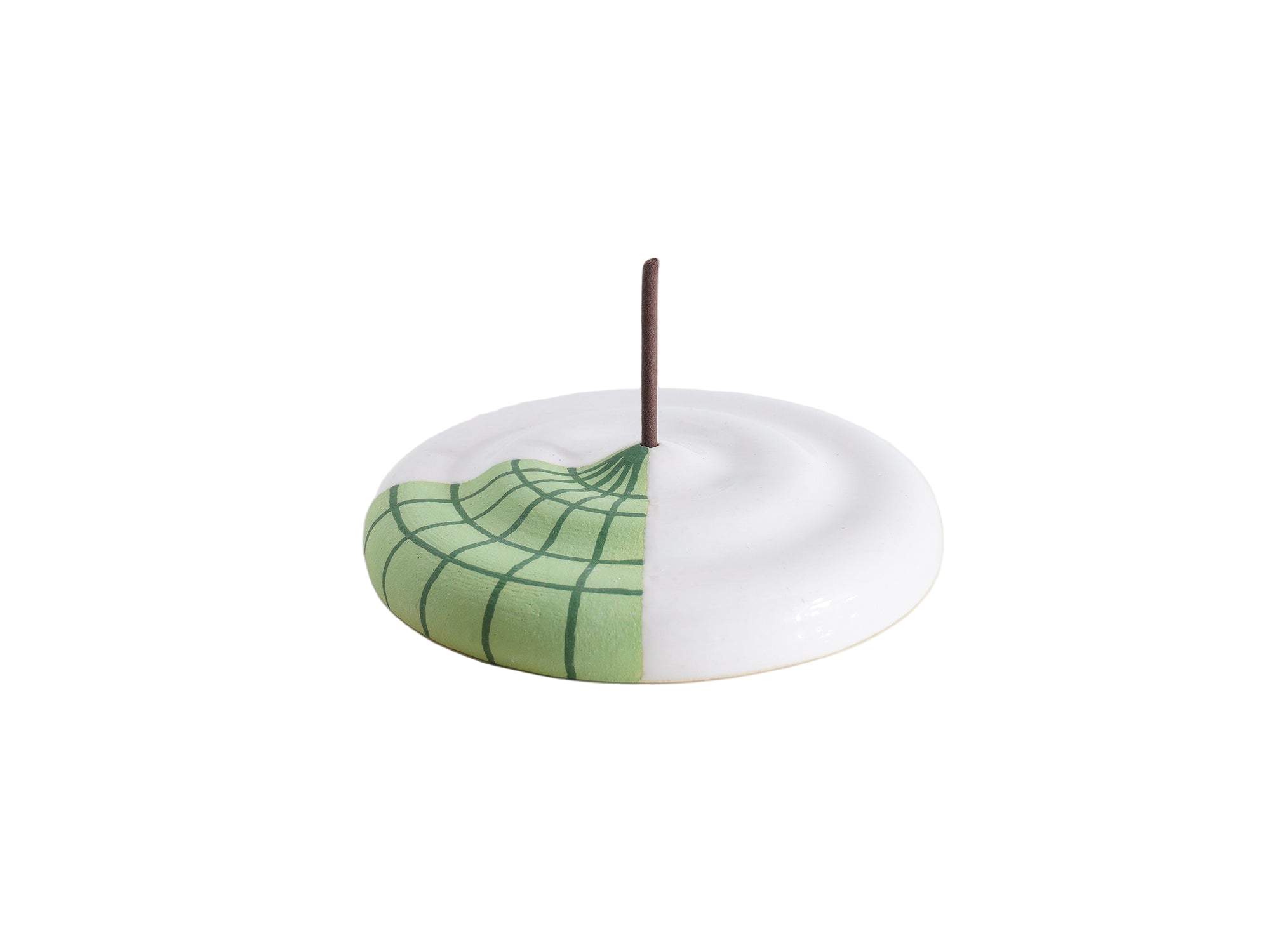 - Hand-thrown off-white stoneware incense holder with hand-painted green design