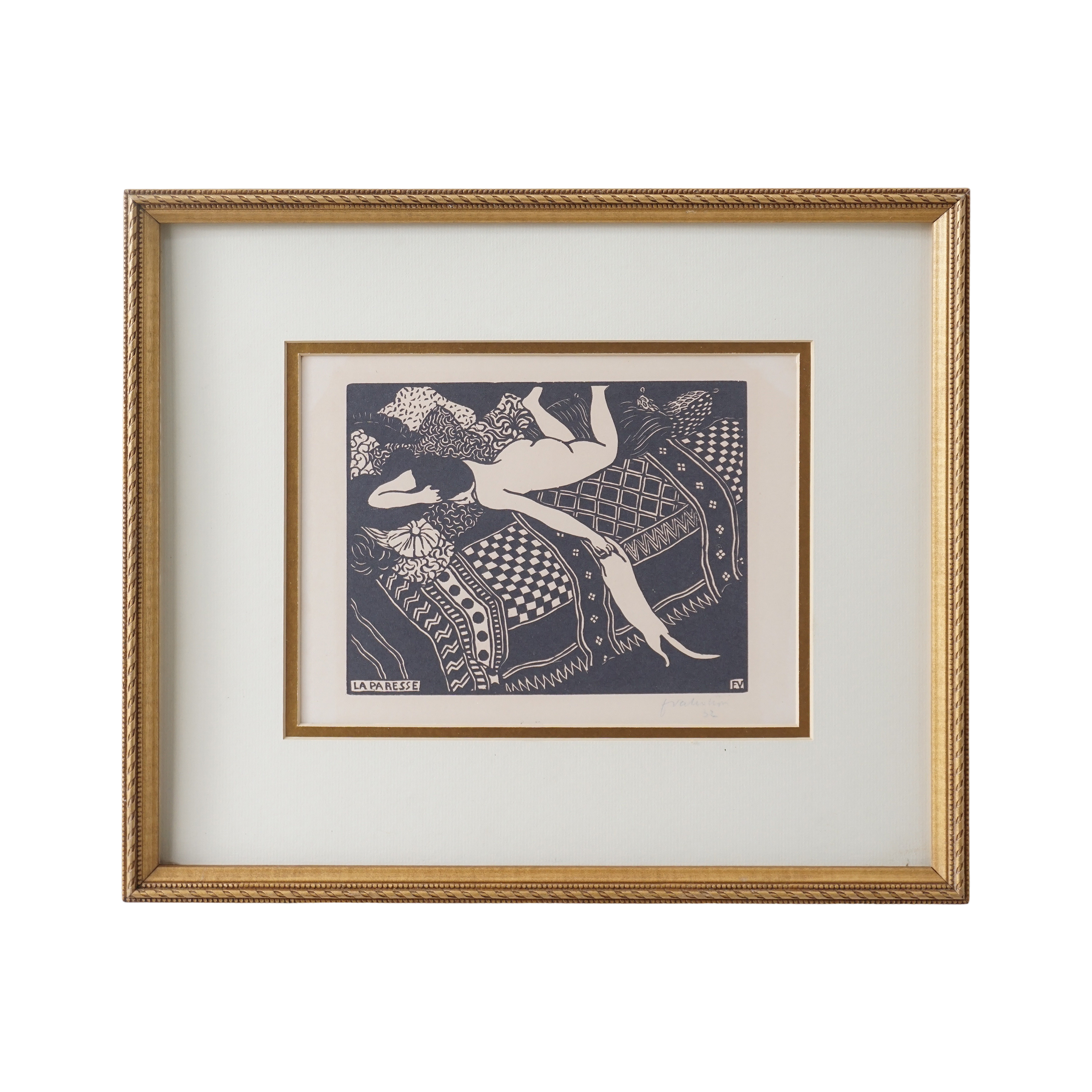 - 15"w, 13"h - Laziness by Félix Vallotton, digitally printed on FSC certified paper, set in a vintage frame with gold mating - Ready to hang - Wood, glass, paper - Condition: Excellent