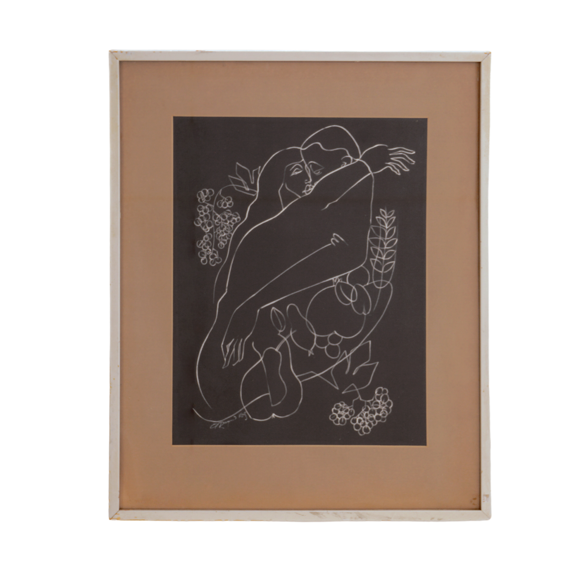 - White brush drawing on black paper, silver painted wooden frame