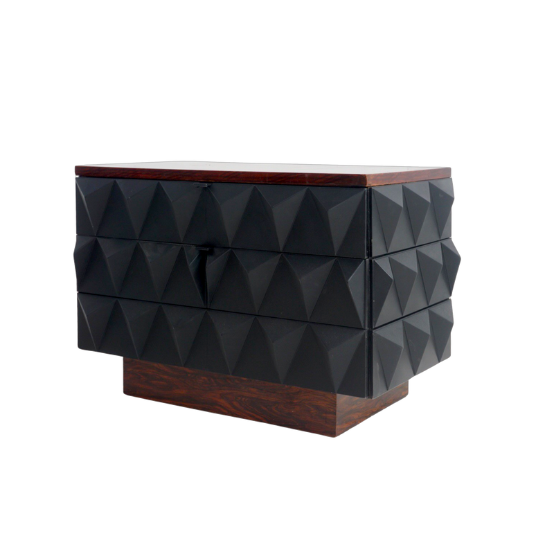 - Brutalist style two-drawer dresser with a rosewood veneer plinth base