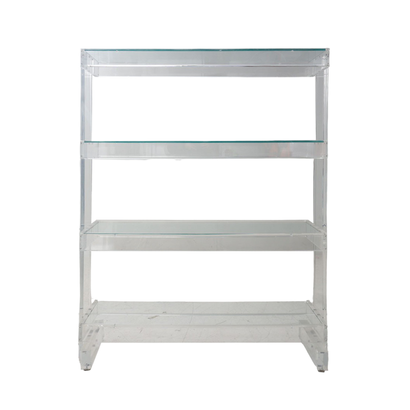 - Condition: Excellent; small chips to corner of 2 glass shelves; a few light scuffs on lucite frame