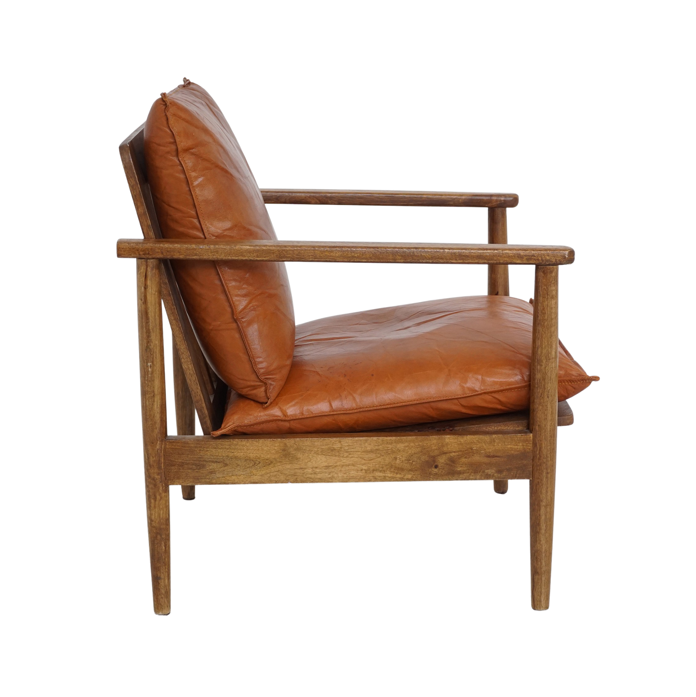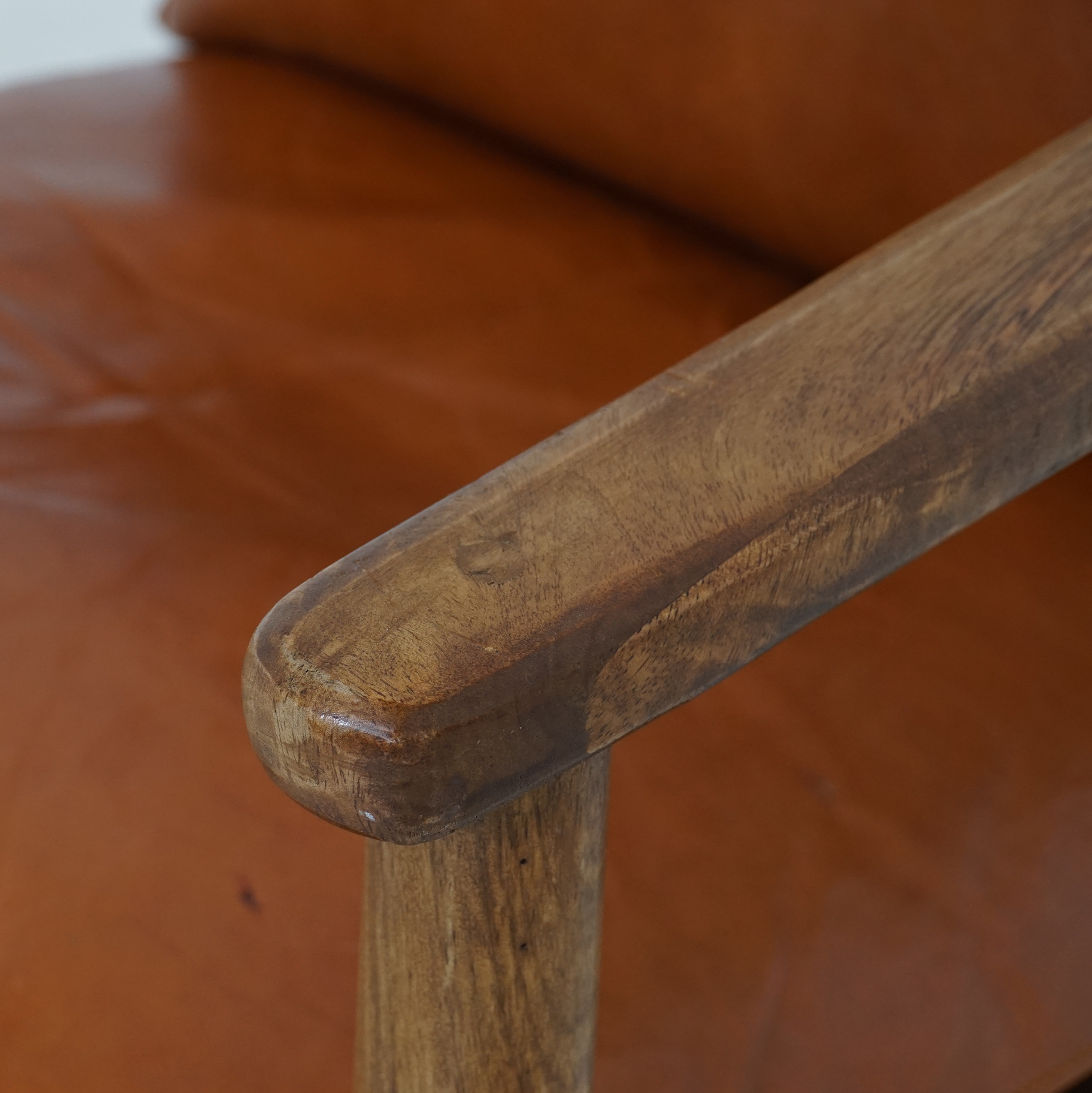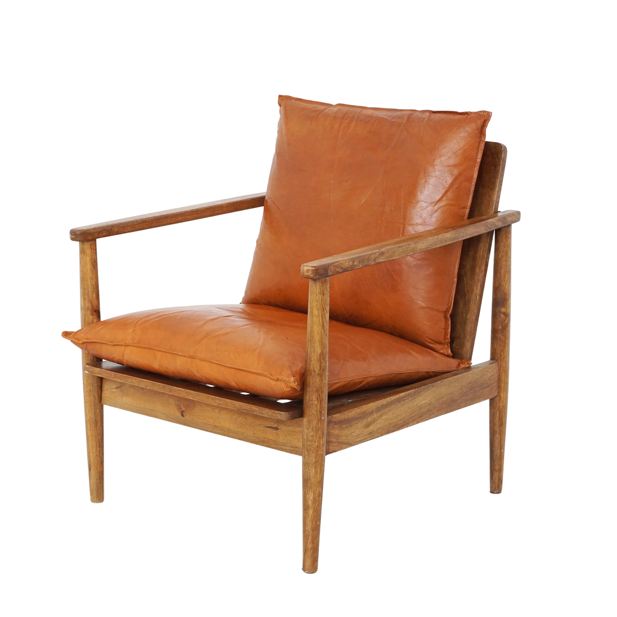Mid-century inspired lounge chair with a solid wood frame and loose leather cushions.