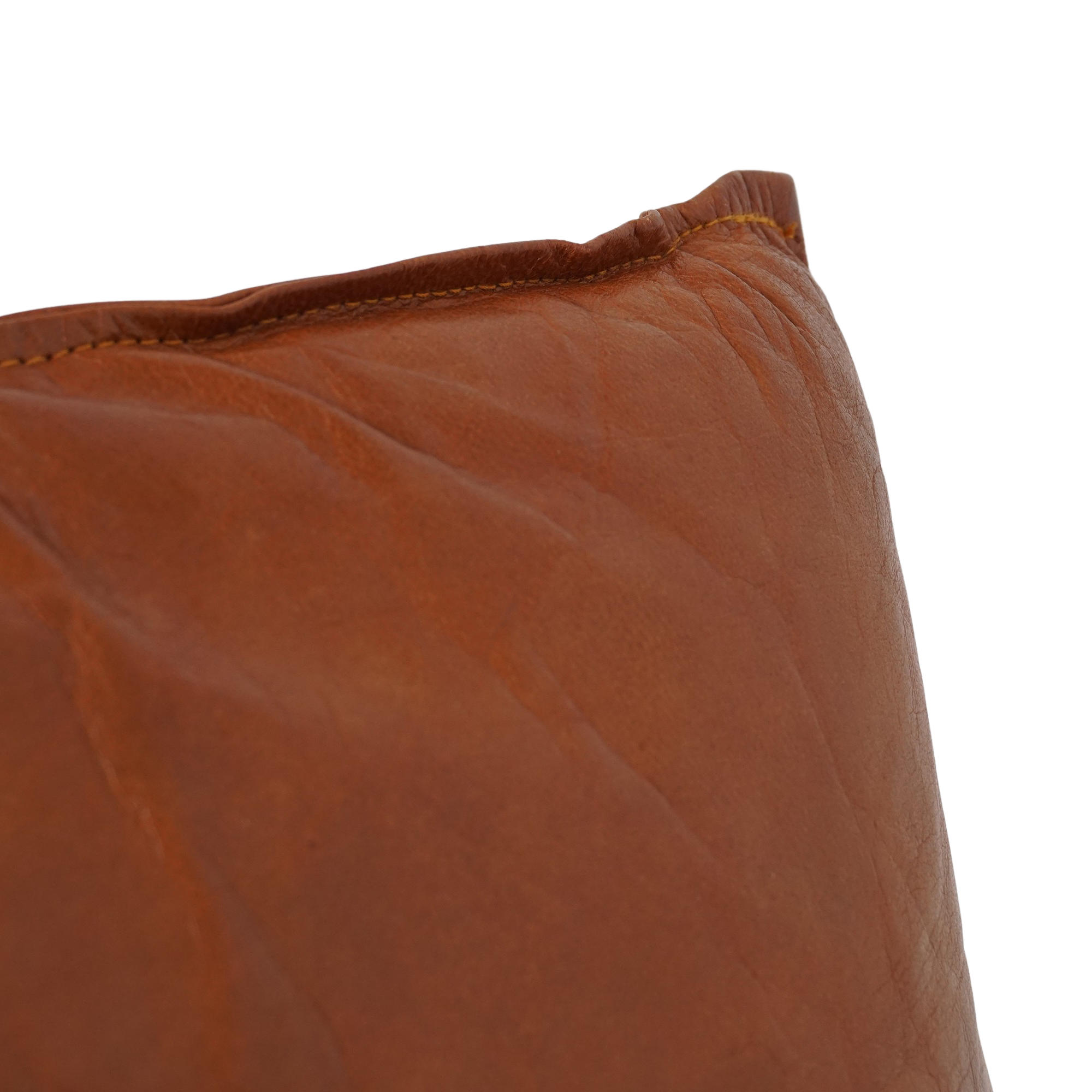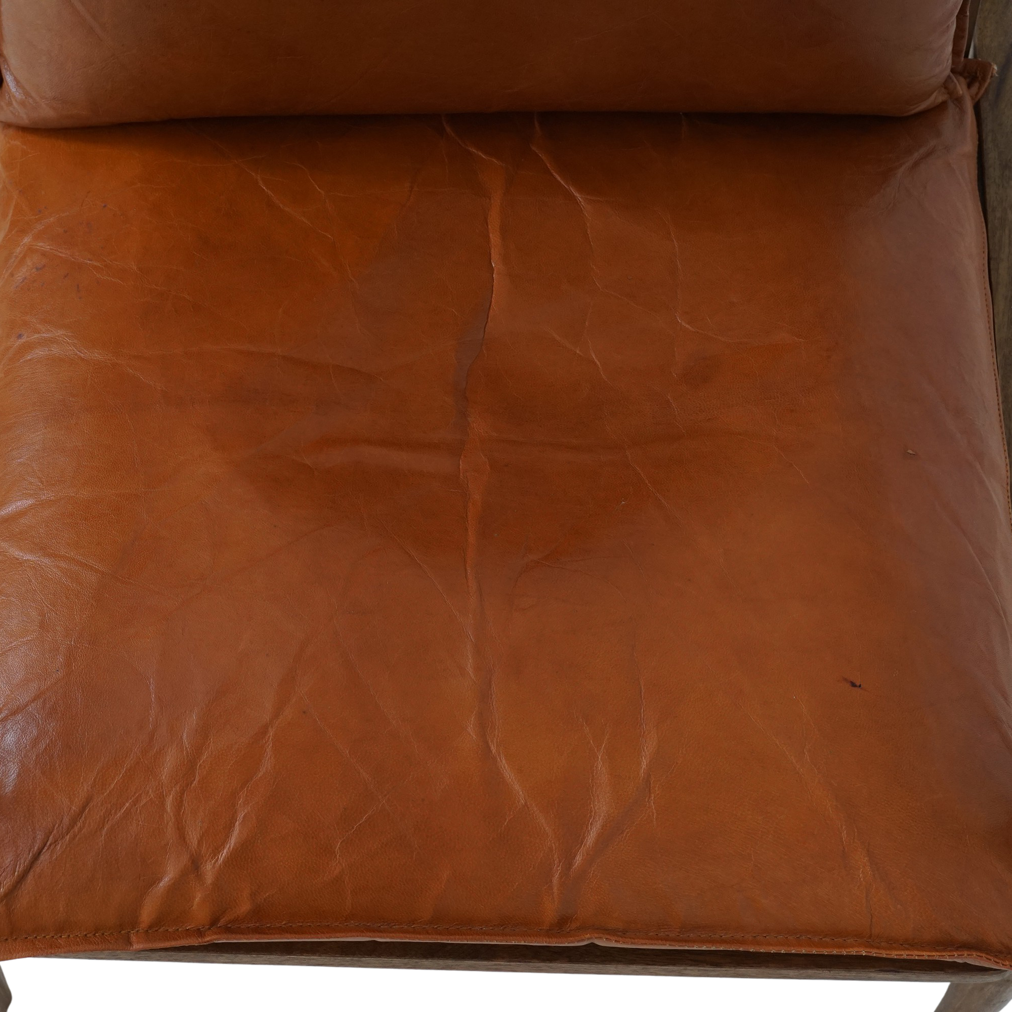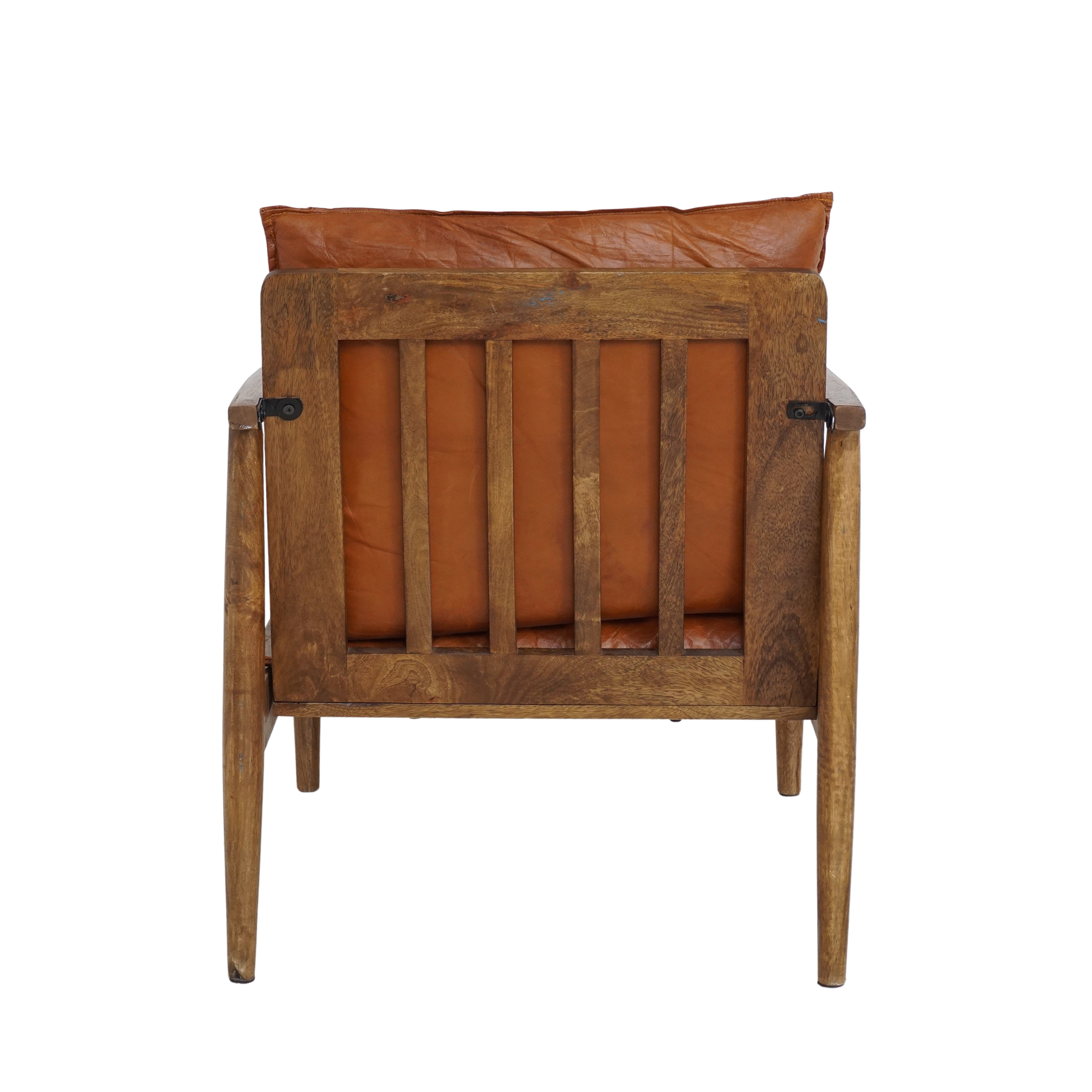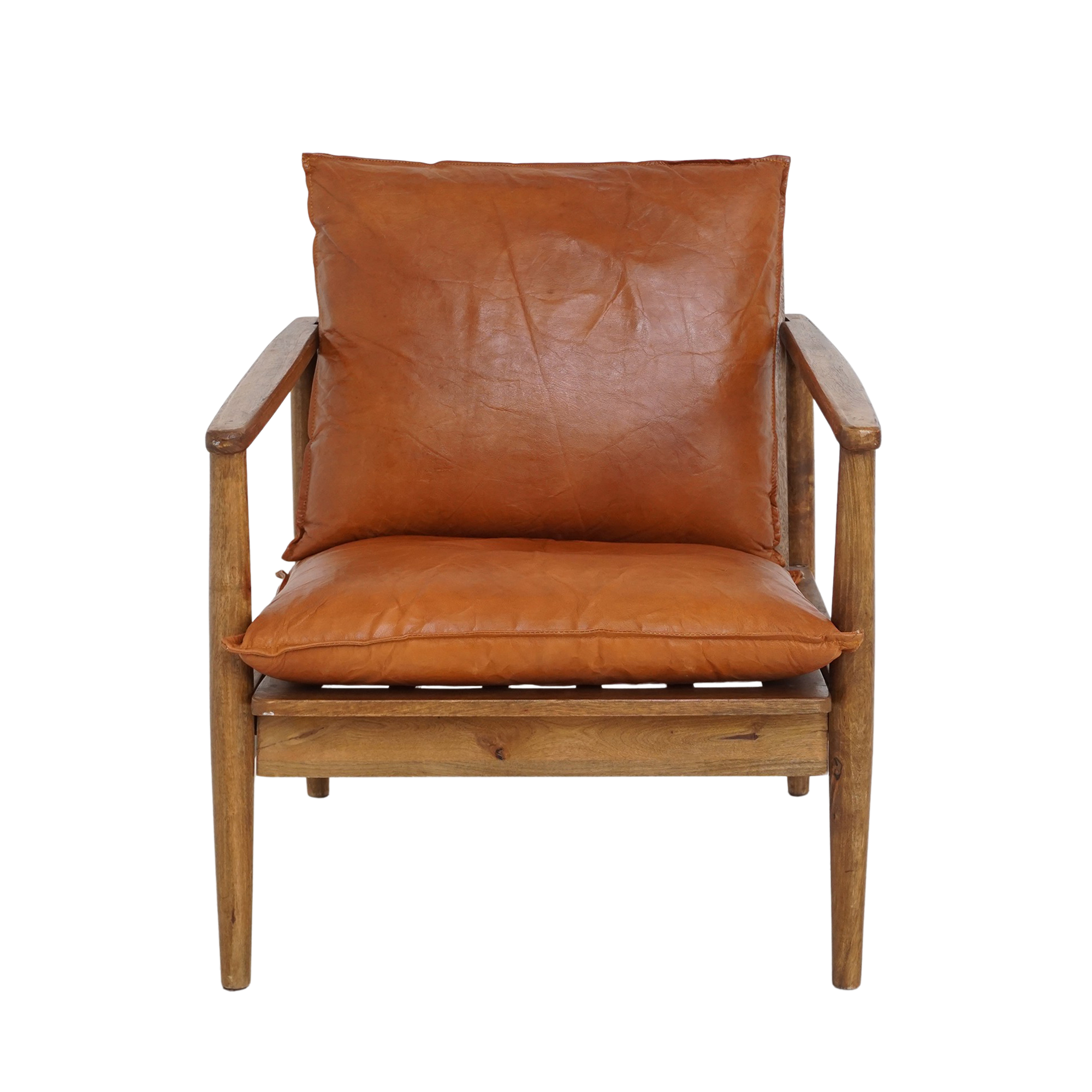 Mid-century inspired lounge chair with a solid wood frame and loose leather cushions.