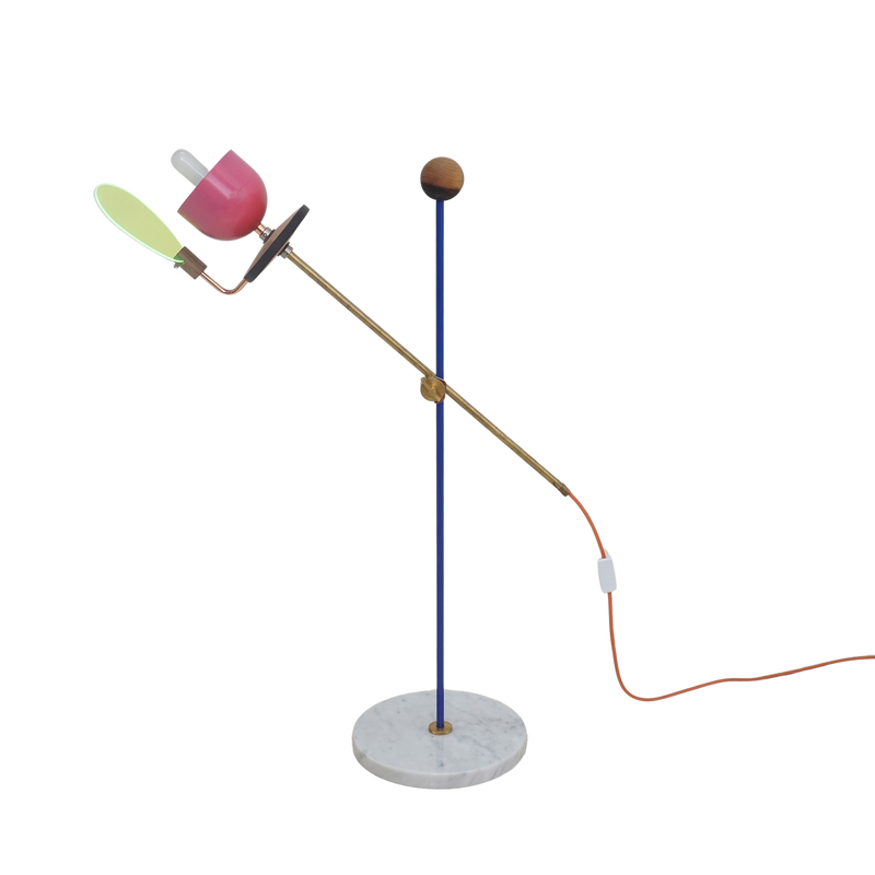- Marble base, hand-painted elements, mixed metals, sculptural wood, and acrylic