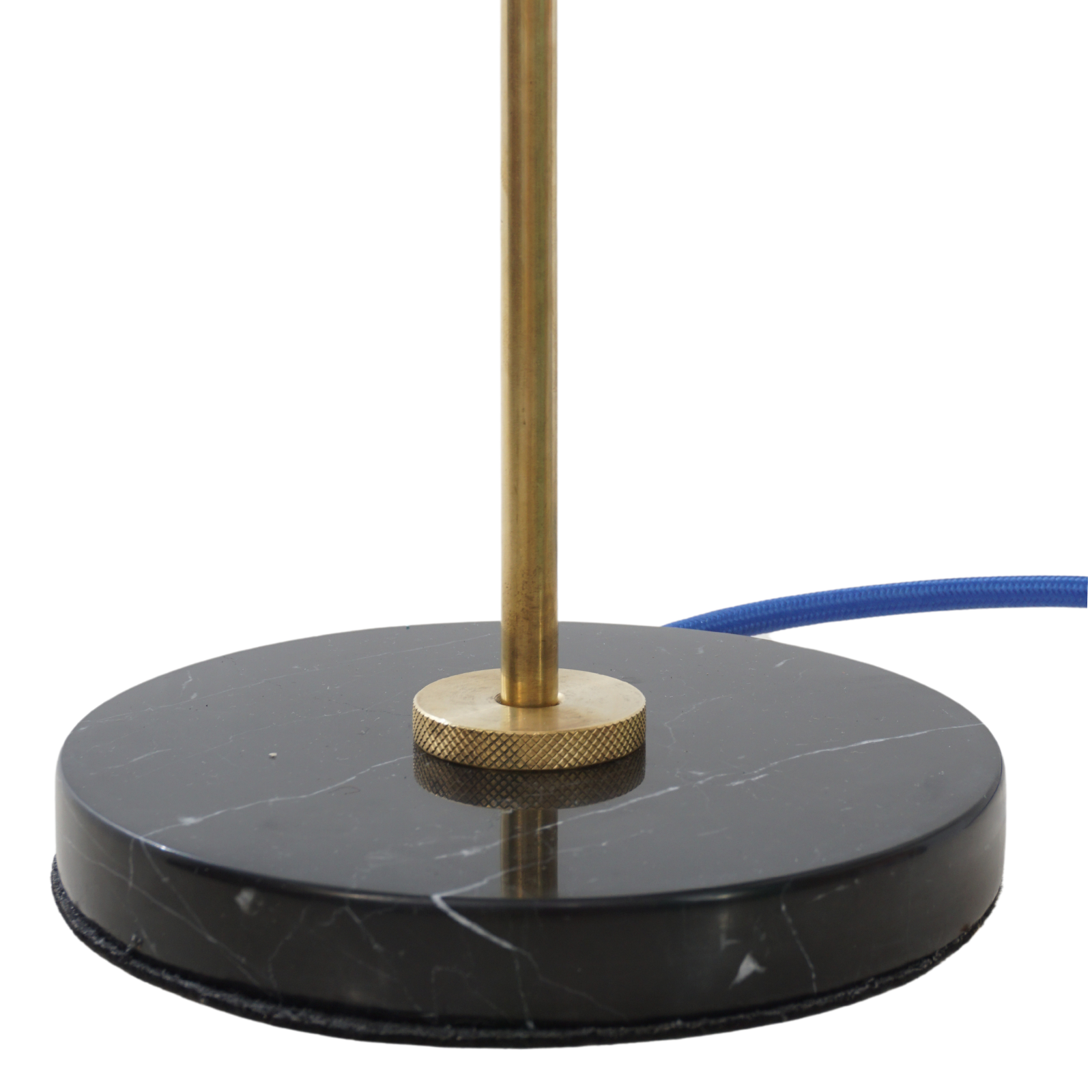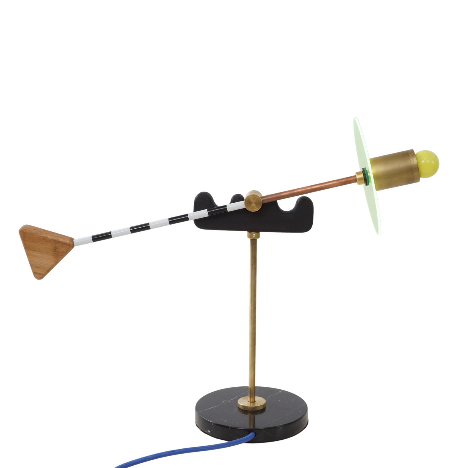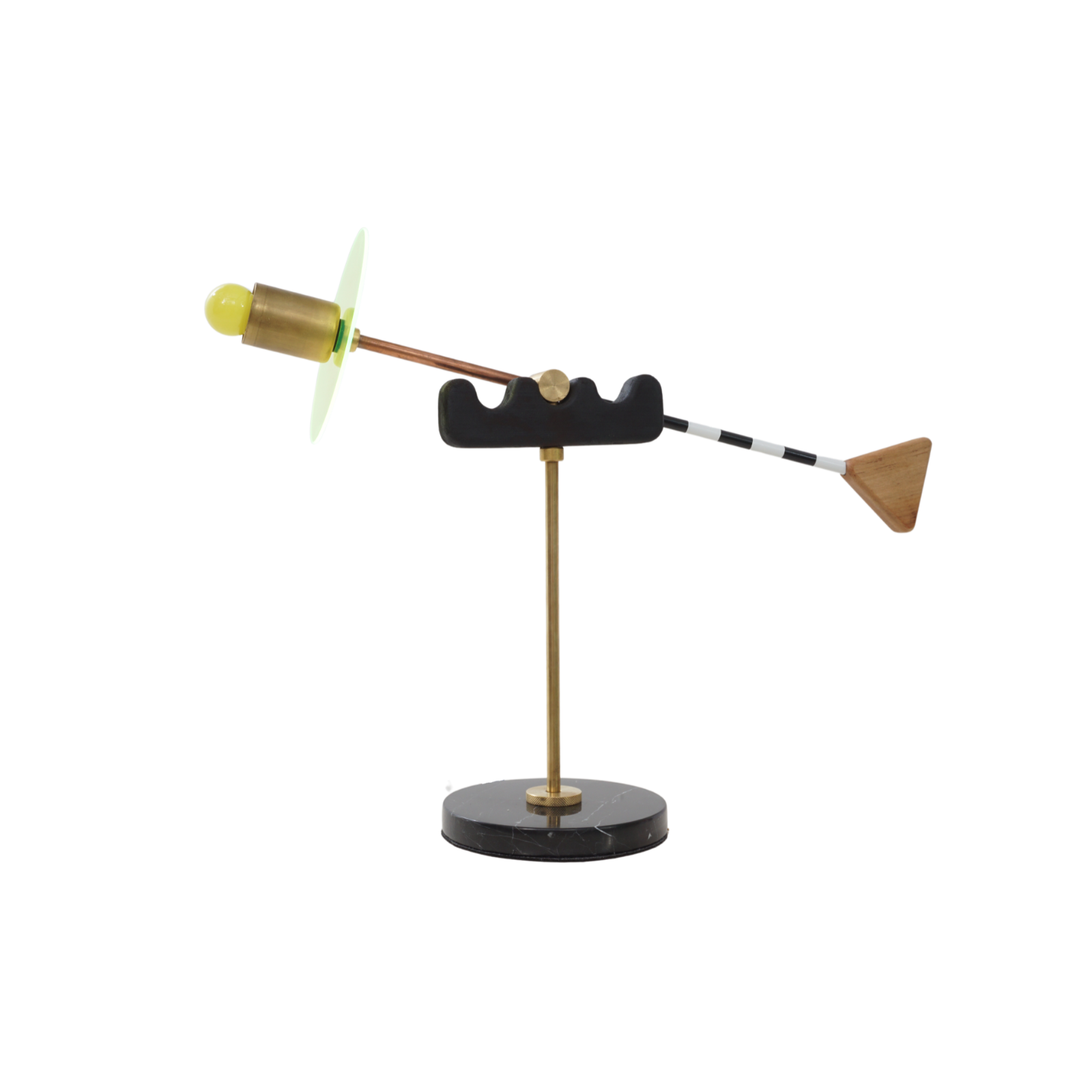 - 20.5"H (moved to highest point), 12"H (moved to lowest point), 6.5" W, 6.5" D -- Marble base, handpainted elements, mixed metals and sculptural wood