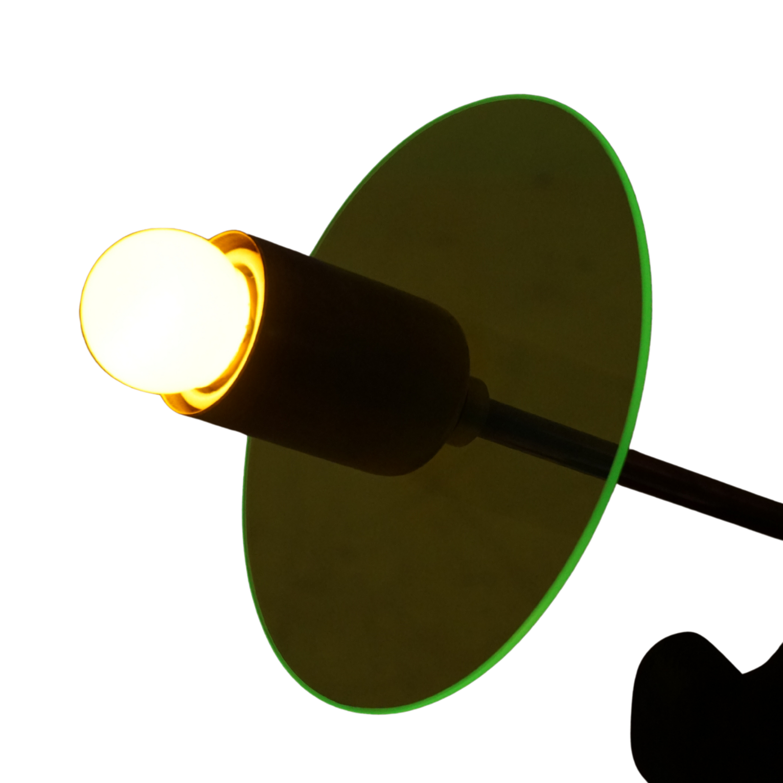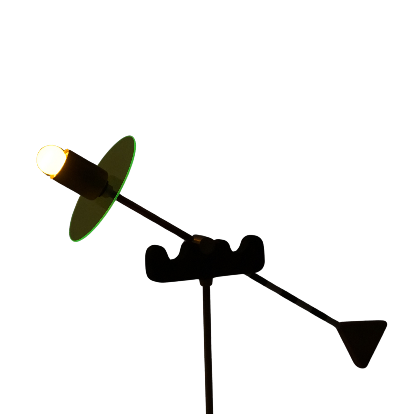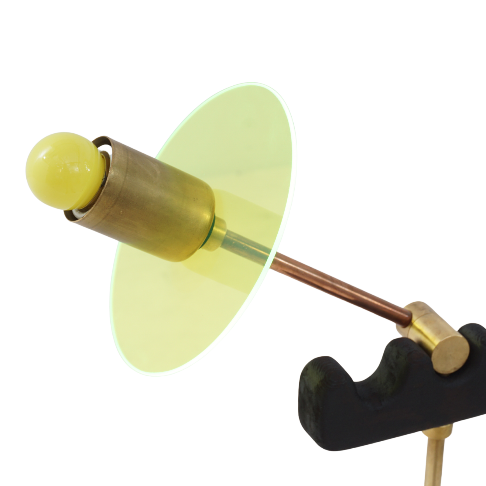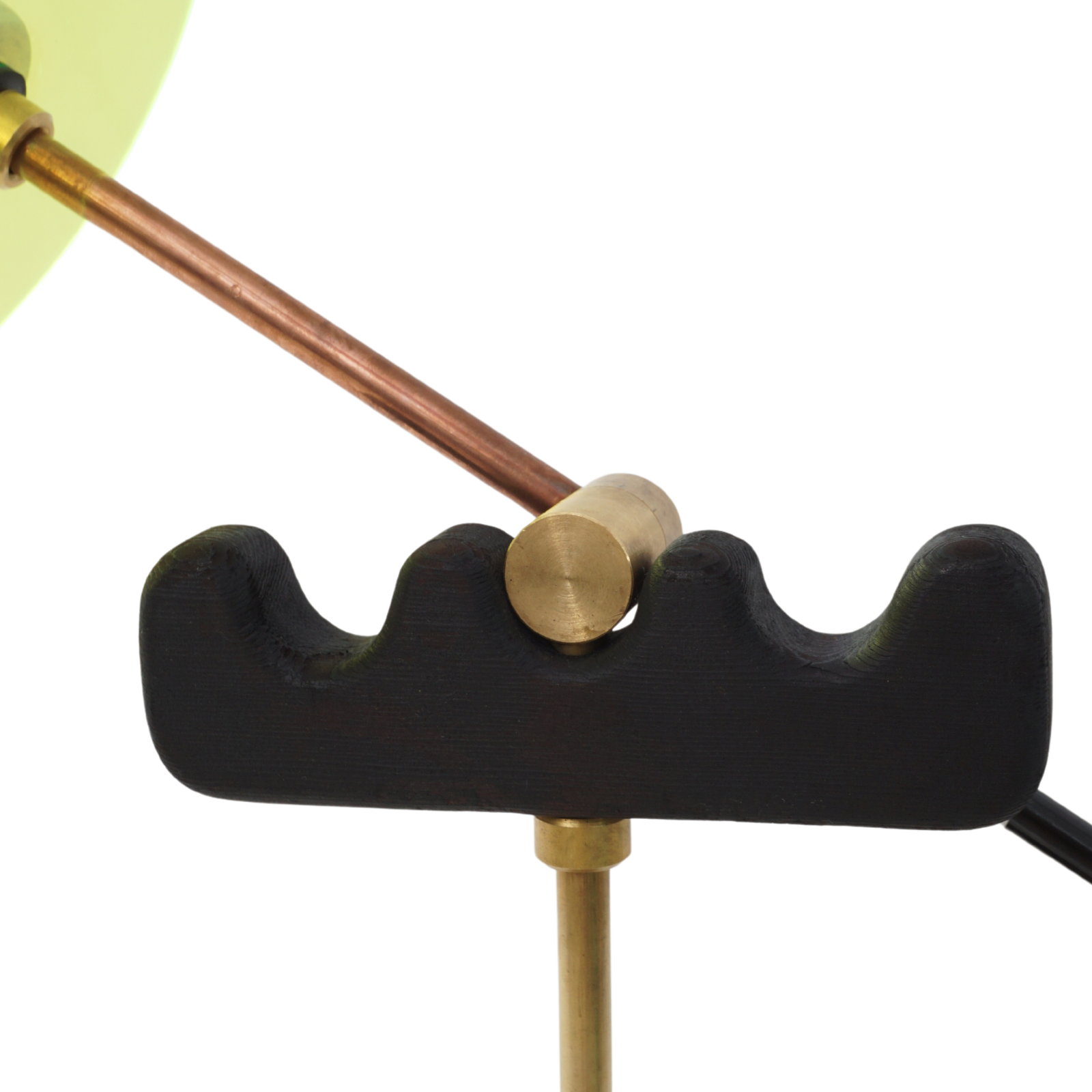 - 20.5"H (moved to highest point), 12"H (moved to lowest point), 6.5" W, 6.5" D -- Marble base, handpainted elements, mixed metals and sculptural wood
