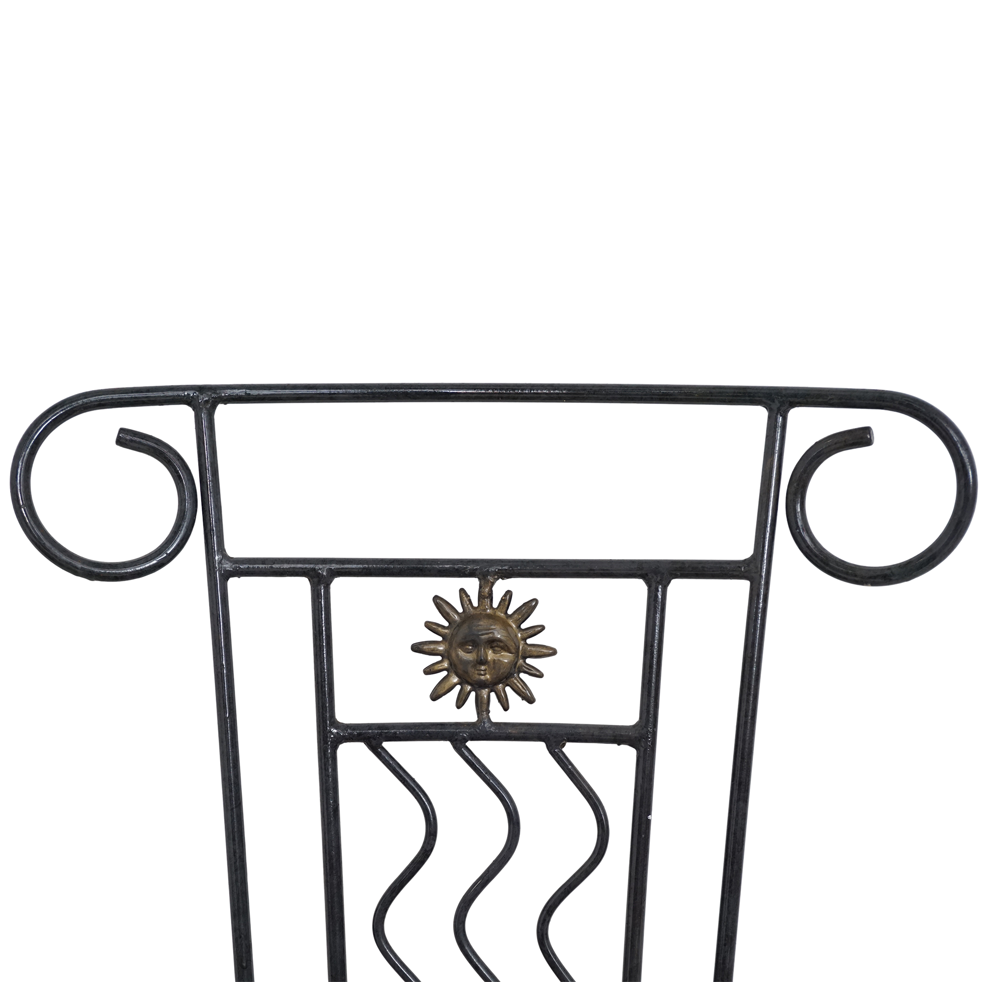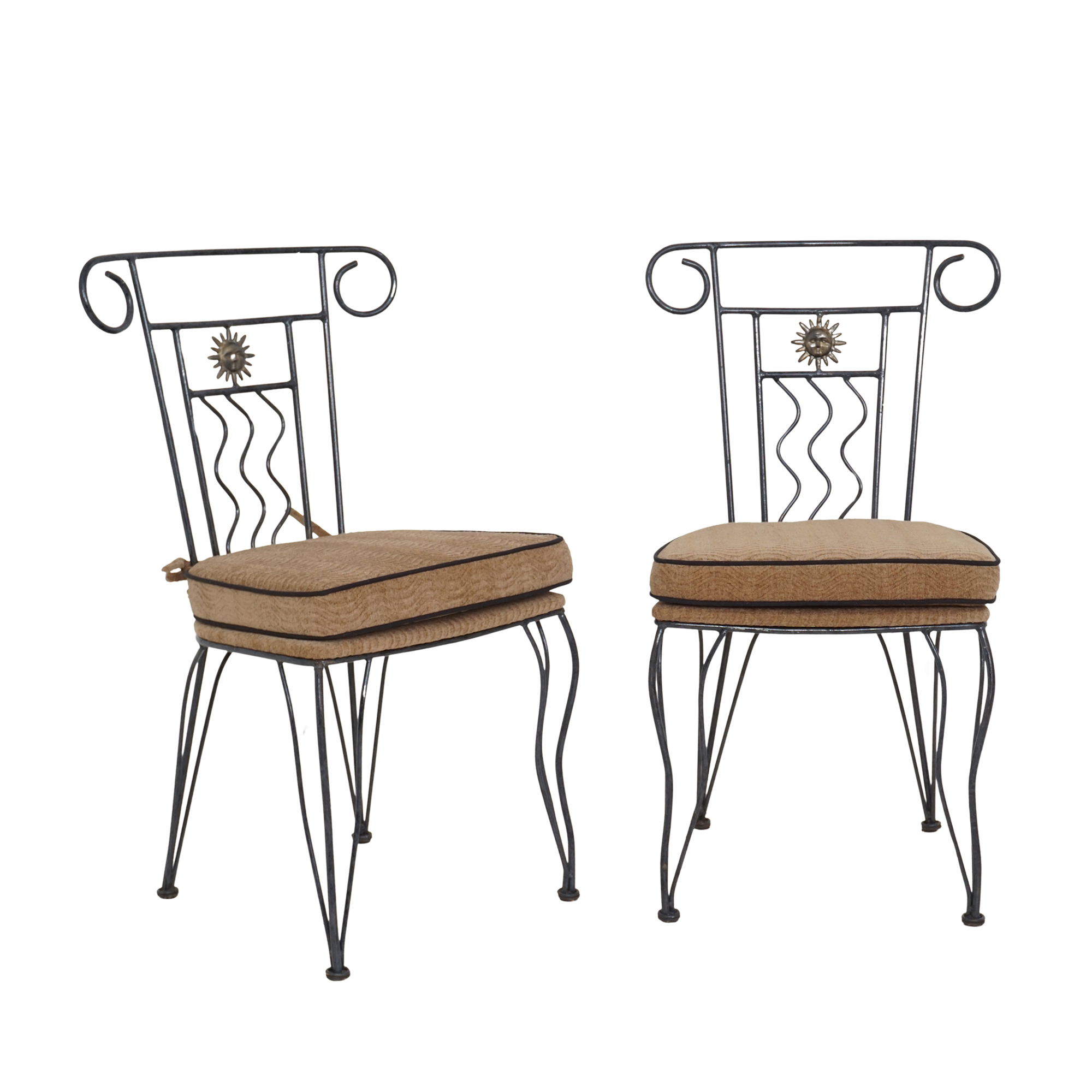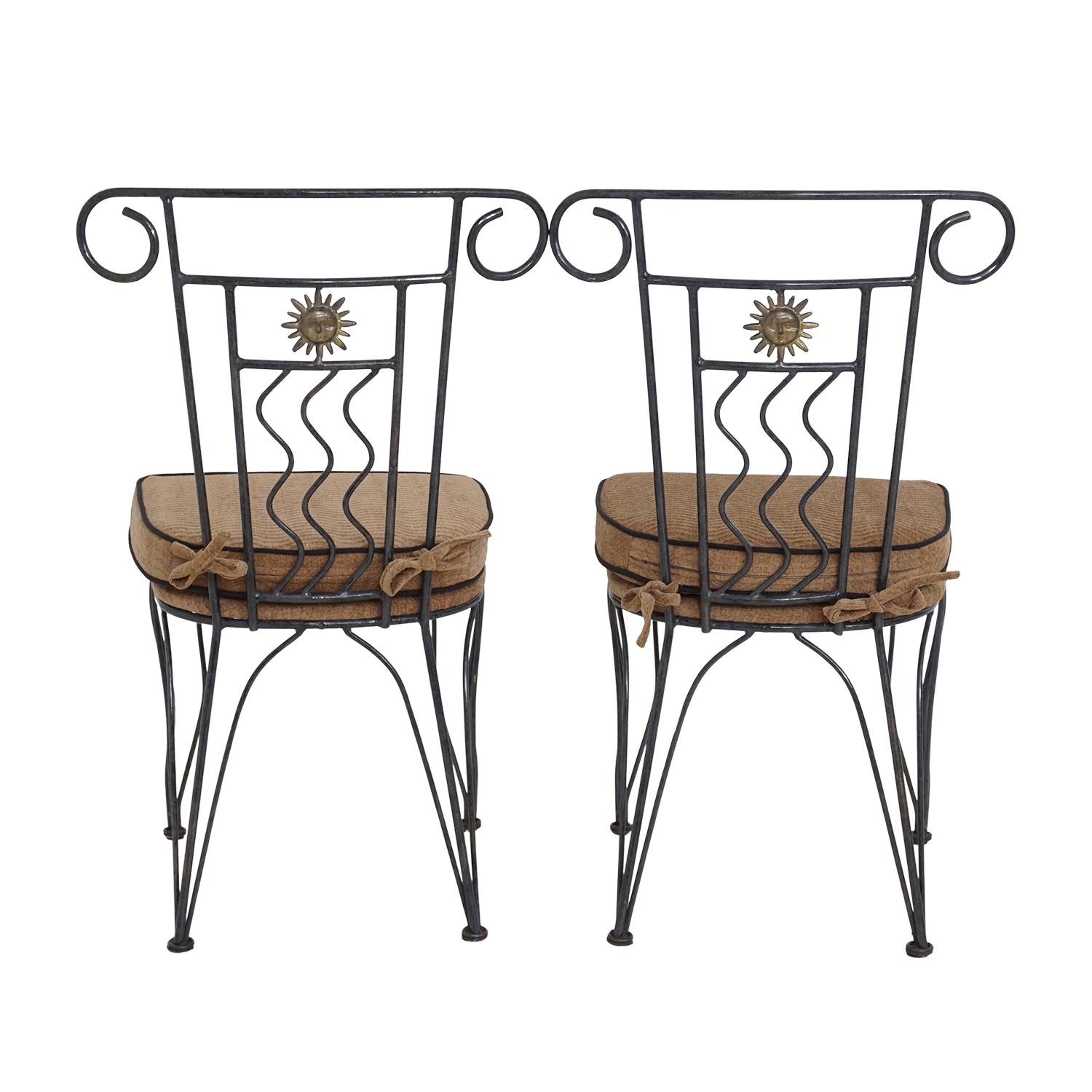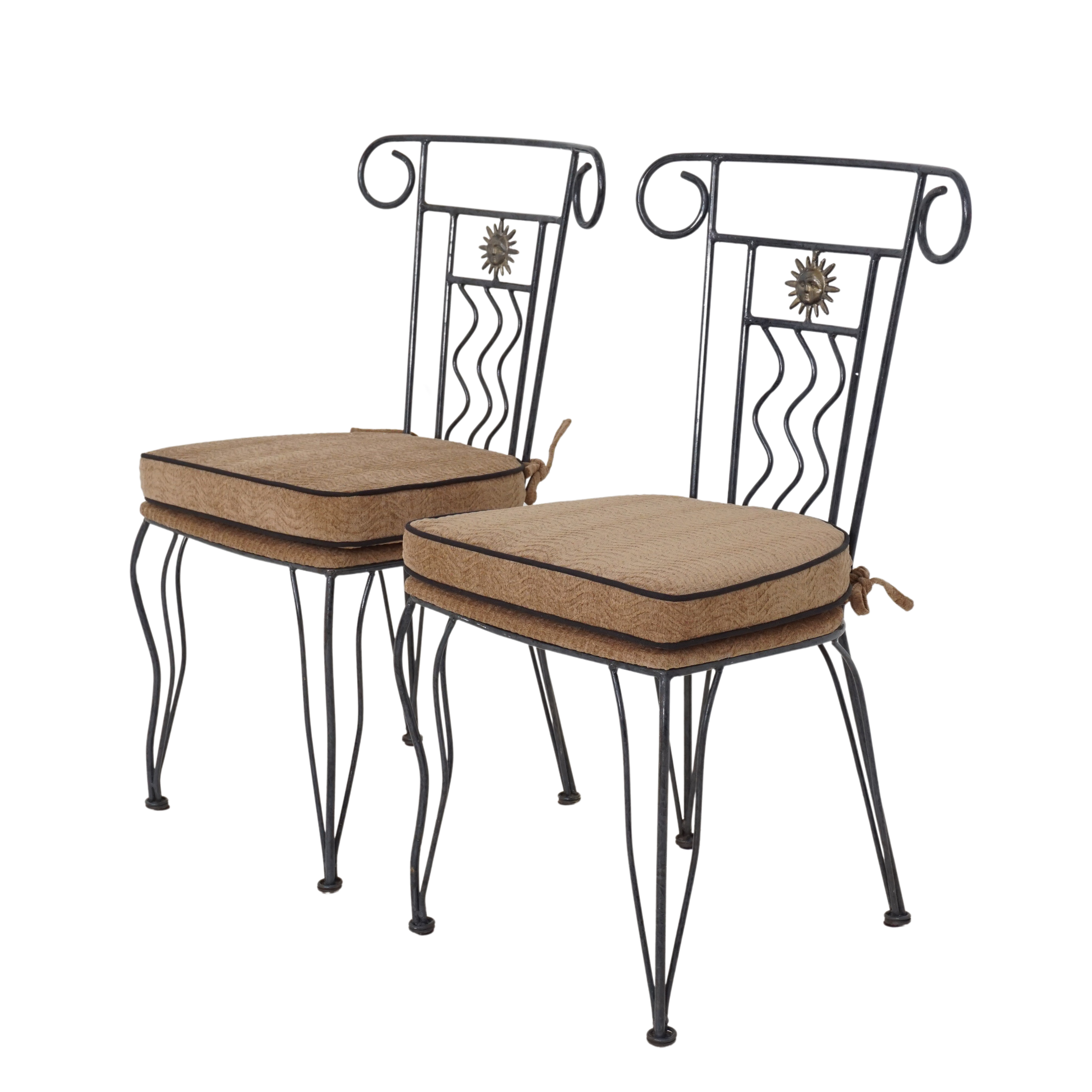 Wrought iron chairs from the mid-20th century. Scrolled details, sunburst medallions, and wavy back supports show clear influence from Spanish Revival and Hollywood Regency styles.