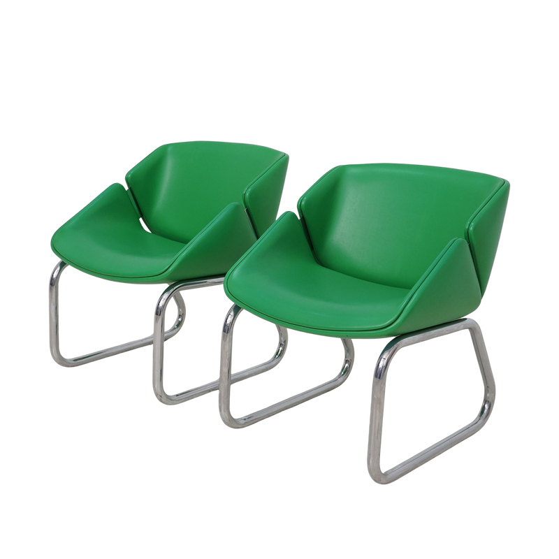 - Condition: Excellent; one chair has a 0.25" tear to inside of right arm and 4.5" light white scuff to top of back; other chair has 0.5"x0.25" divet to vinyl and two light black scuffs (2" and 0.75") to outside of left arm