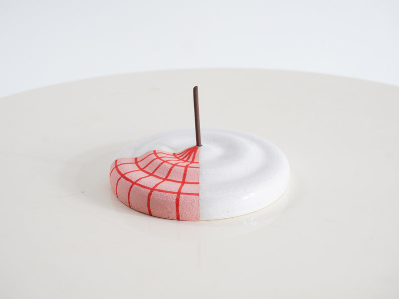 - Hand-thrown off-white stoneware incense holder with hand-painted pink design