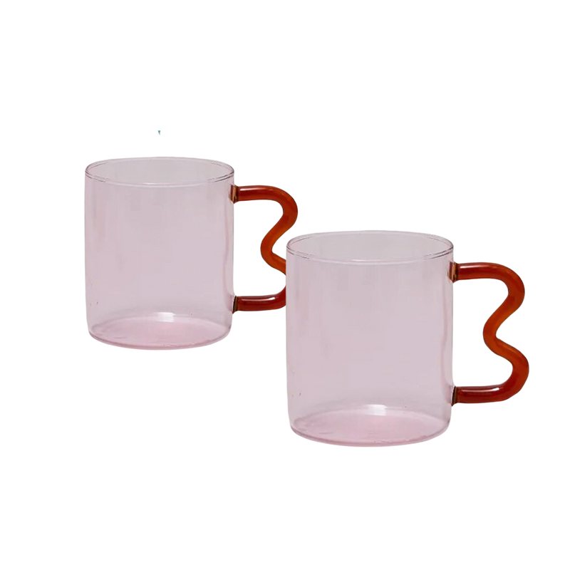 - Pink glass mug with red glass wavy handle