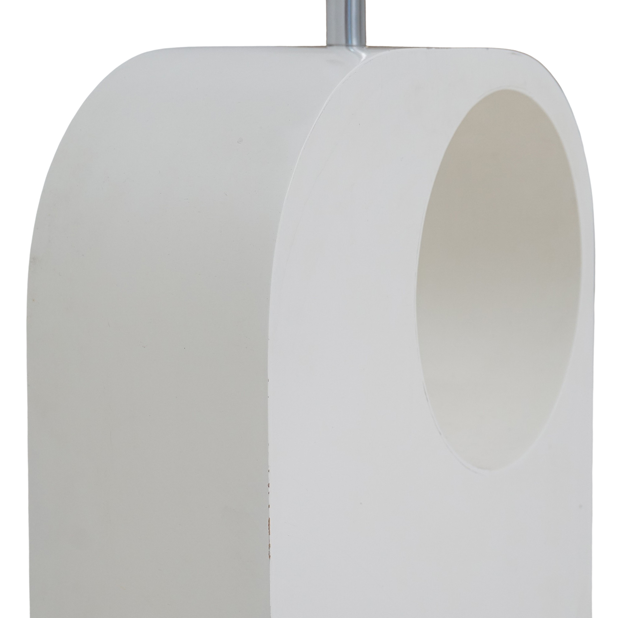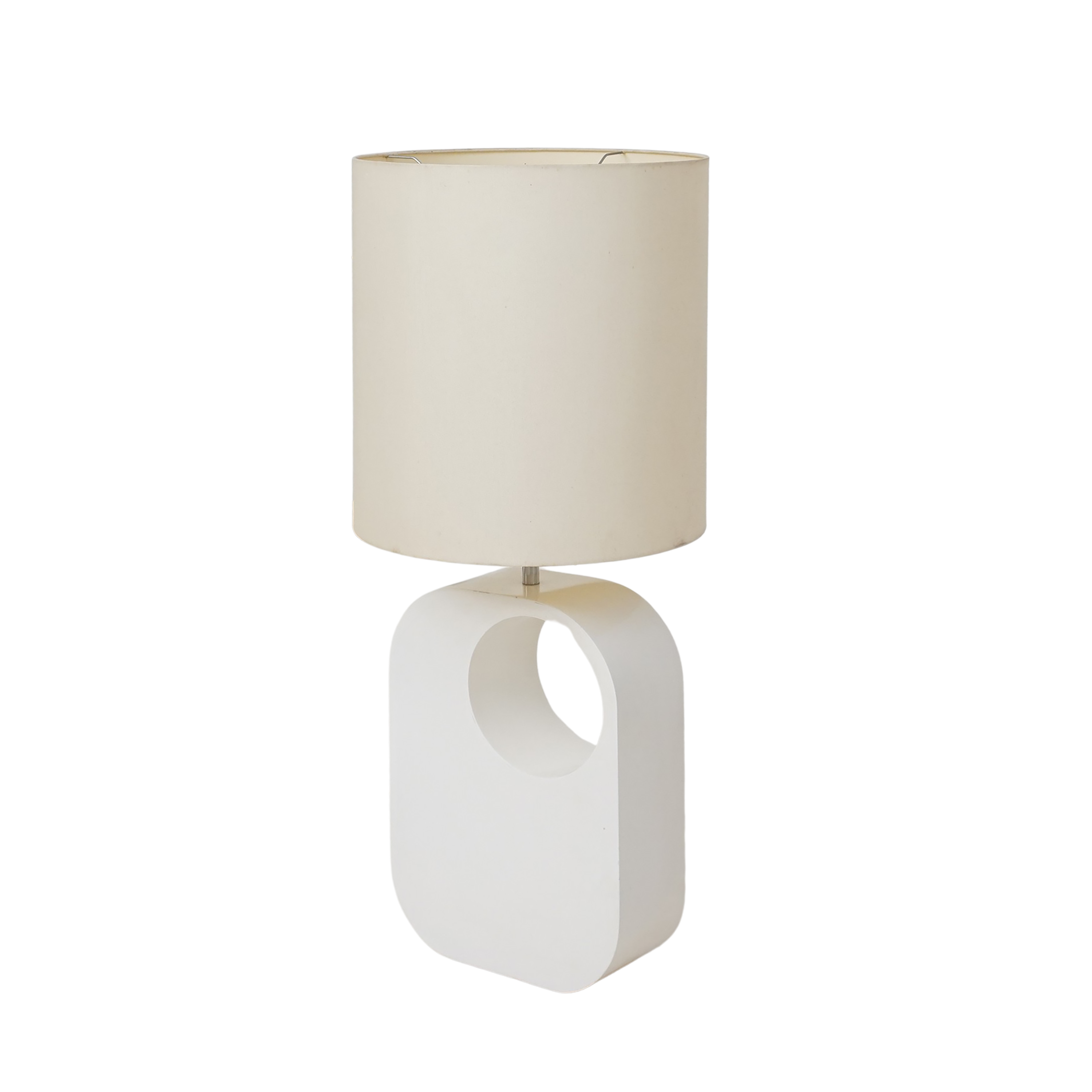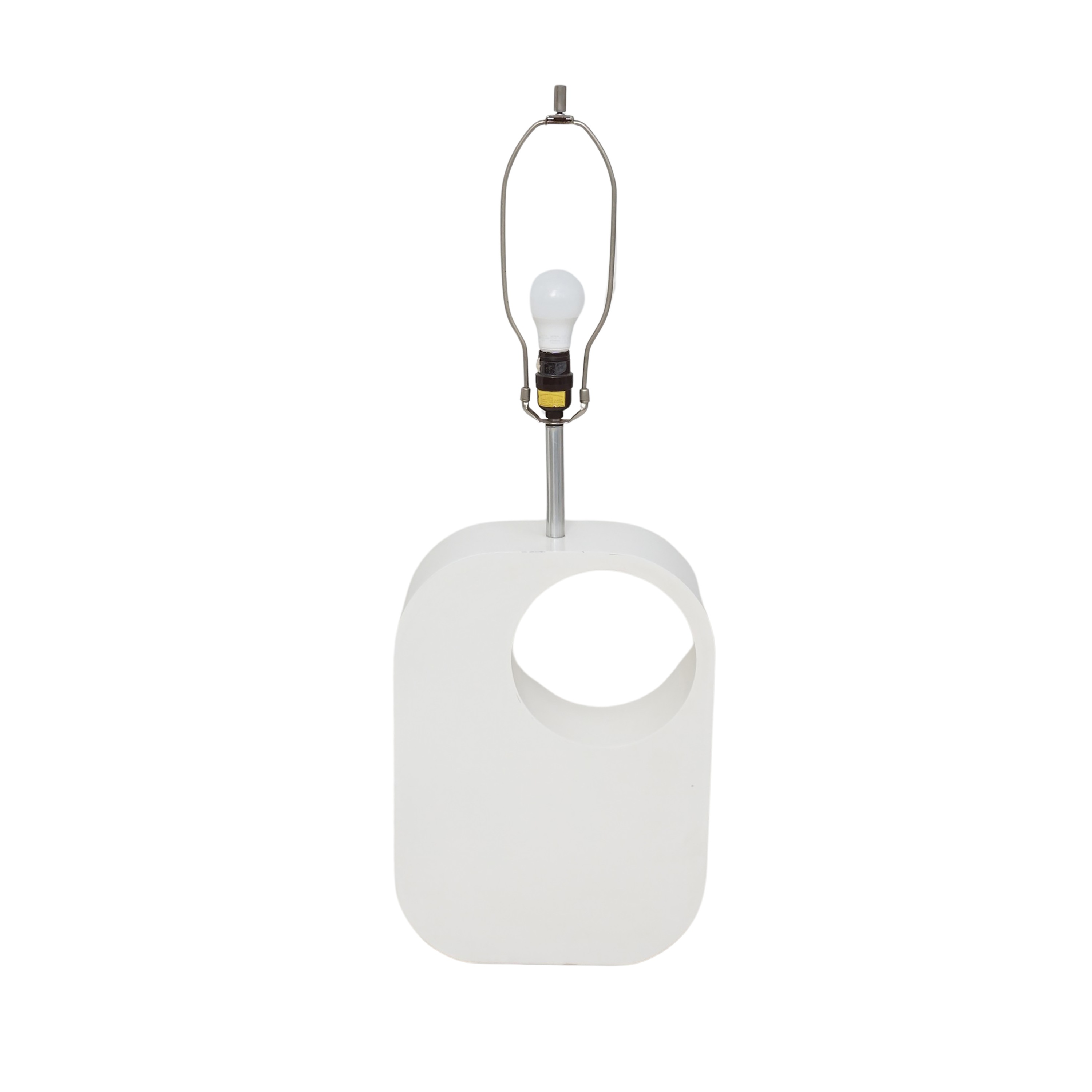 A playful postmodern spin on a classic contour, this table lamp can shine on its own, while also allowing other furniture partners in crime to have their moment in the limelight. Its clean rectangular silhouette is softened by subtly rounded edges and a circular cut-out à la Swiss cheese. Crafted from lacquered wood with a gloss finish, this lamp is shiny and sleek, offering a contrast between its solid construction and the light, airy feel of the negative space within the cutout.