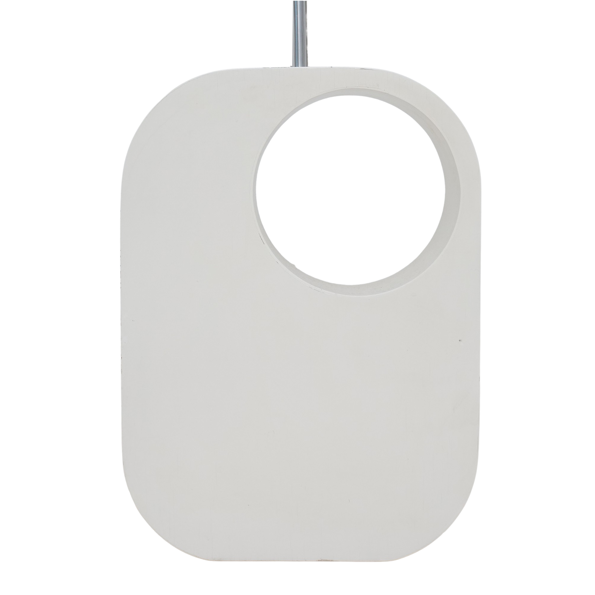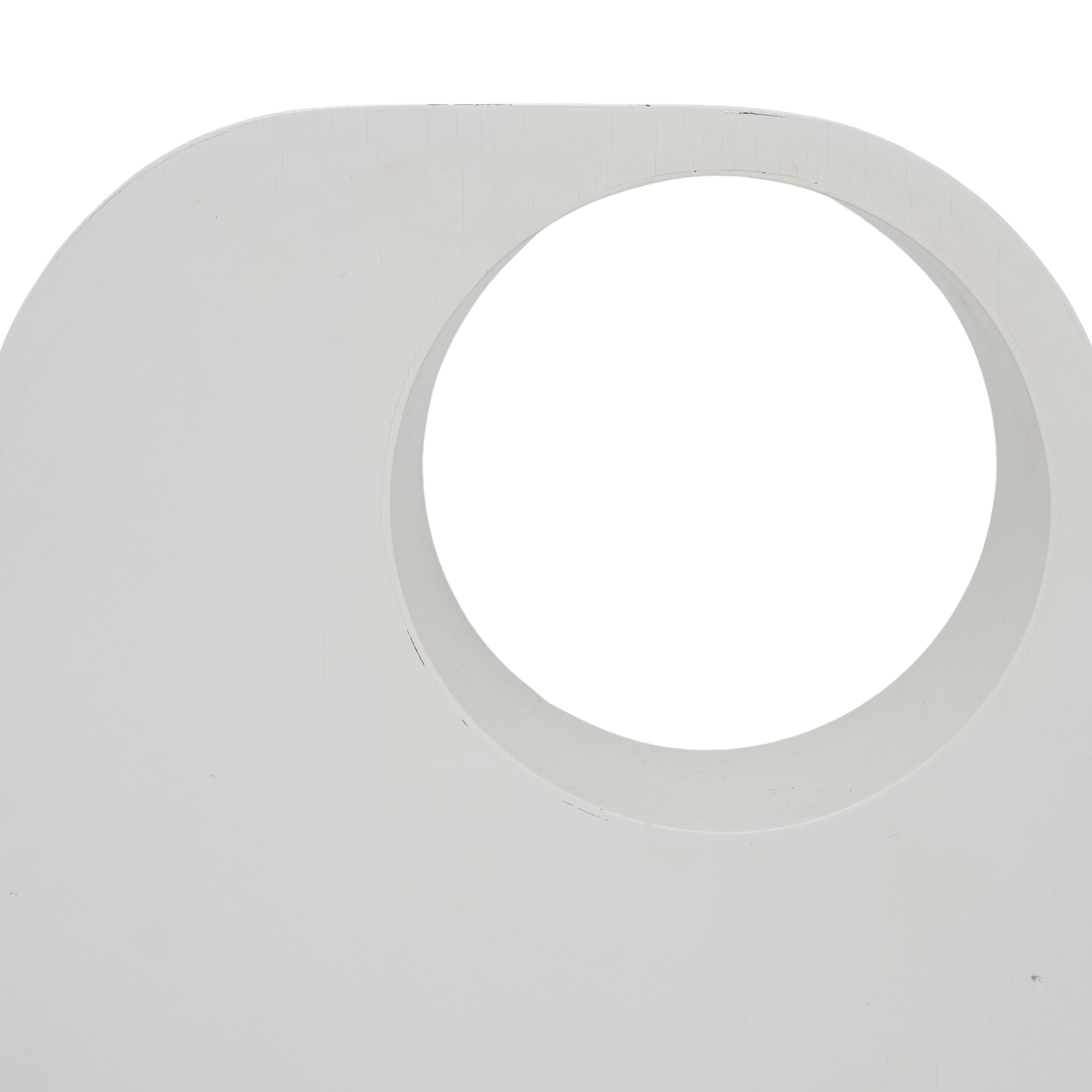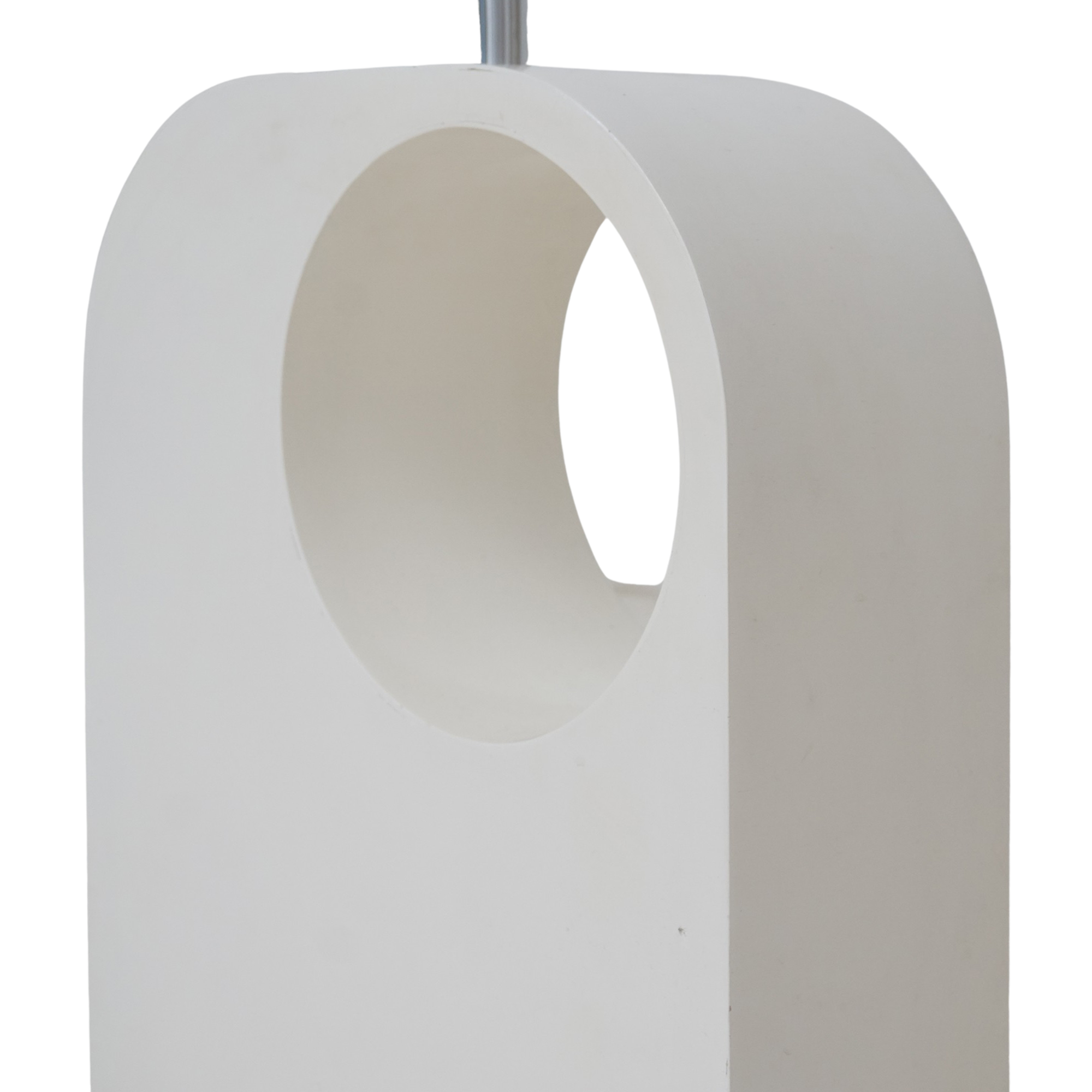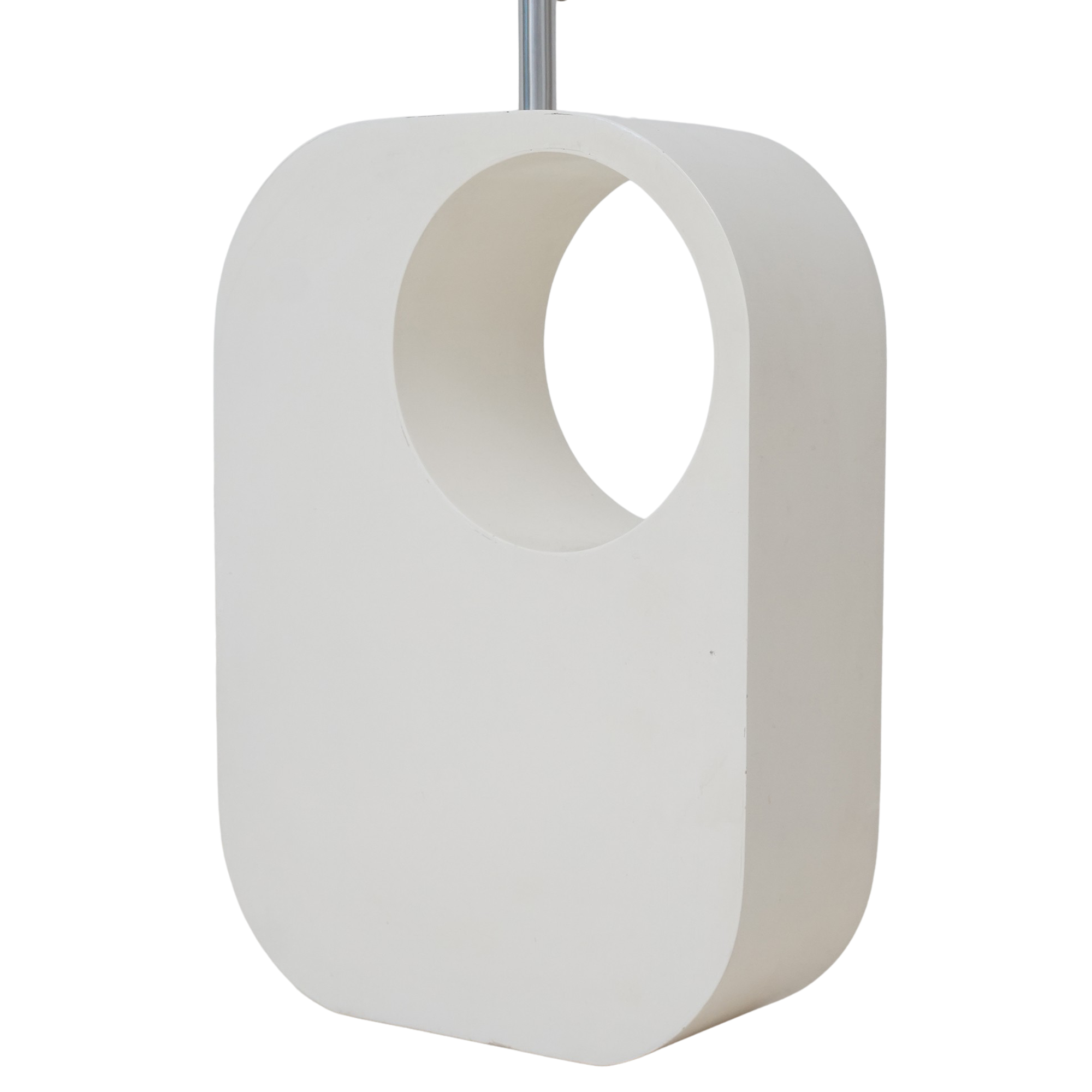 A playful postmodern spin on a classic contour, this table lamp can shine on its own, while also allowing other furniture partners in crime to have their moment in the limelight. Its clean rectangular silhouette is softened by subtly rounded edges and a circular cut-out à la Swiss cheese. Crafted from lacquered wood with a gloss finish, this lamp is shiny and sleek, offering a contrast between its solid construction and the light, airy feel of the negative space within the cutout.
