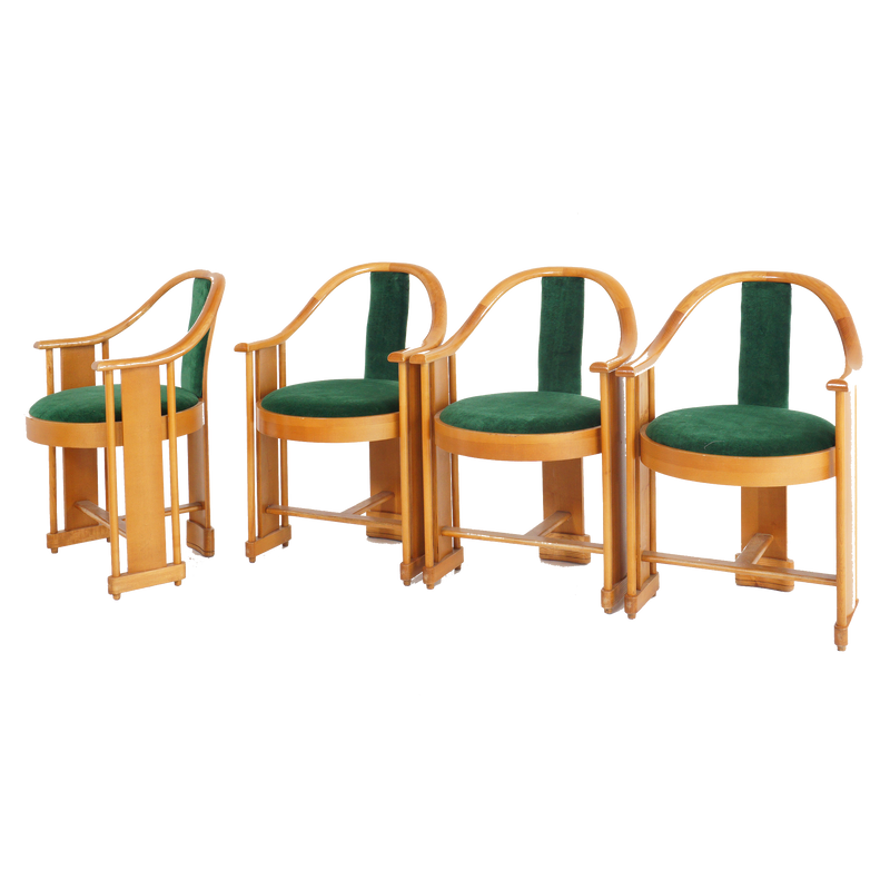 These Italian armchairs set a good example - your seating should have curves in all the right places. The aged pine rounded backs envelop you, while the emerald upholstery welcomes you with warmth and comfort. Classic craftsmanship fused with velvety opulence - your experience around the table doesn't get more atmospheric than this.