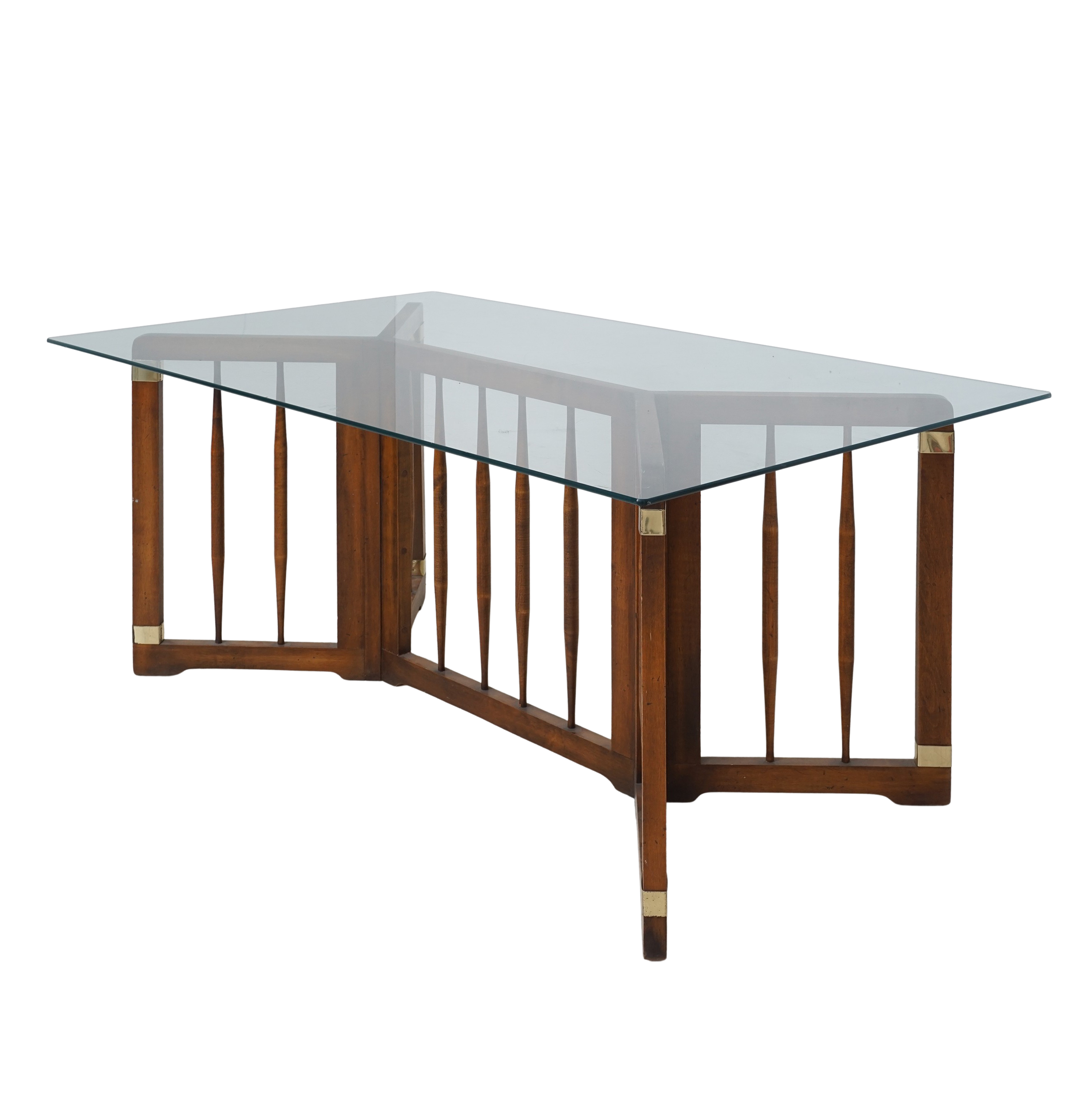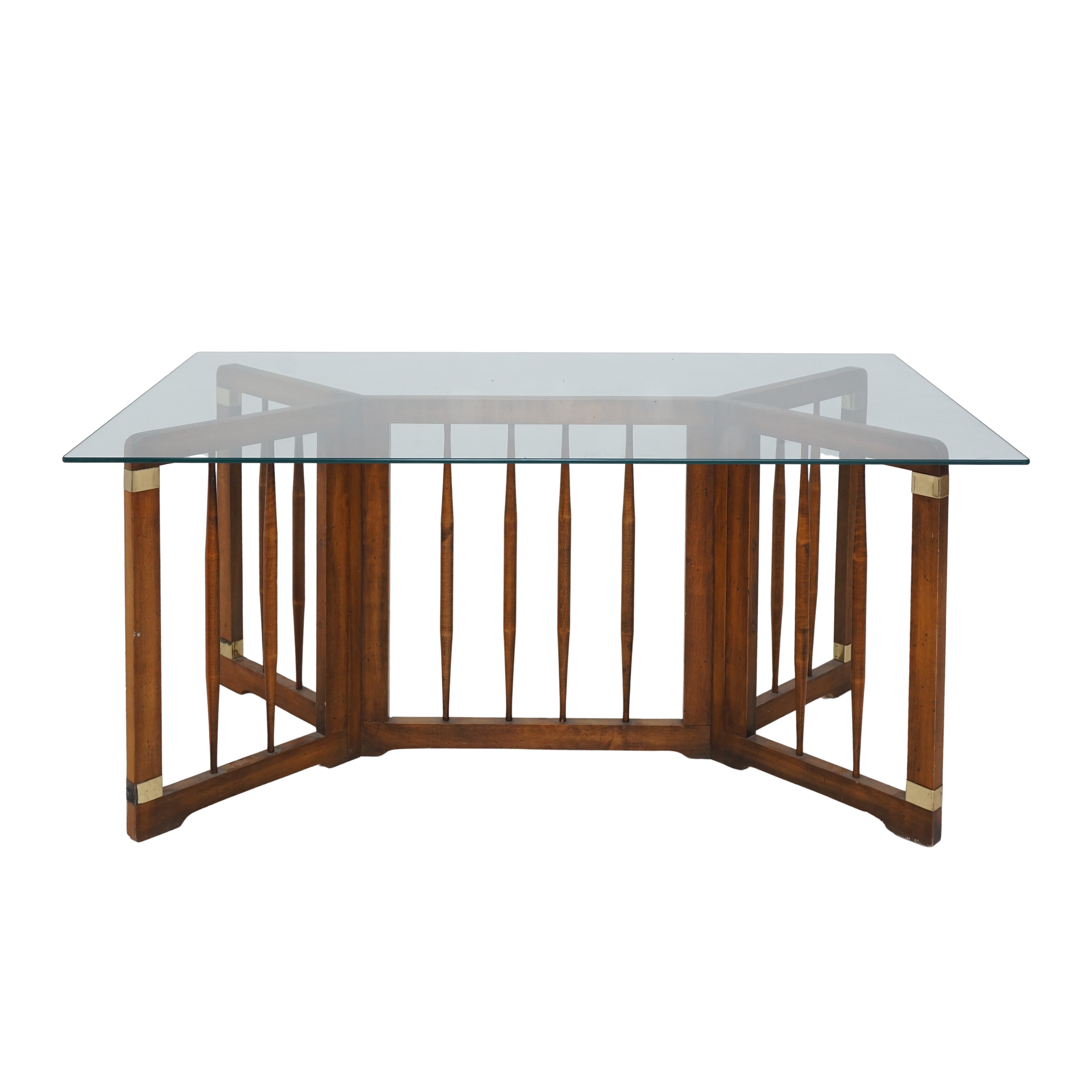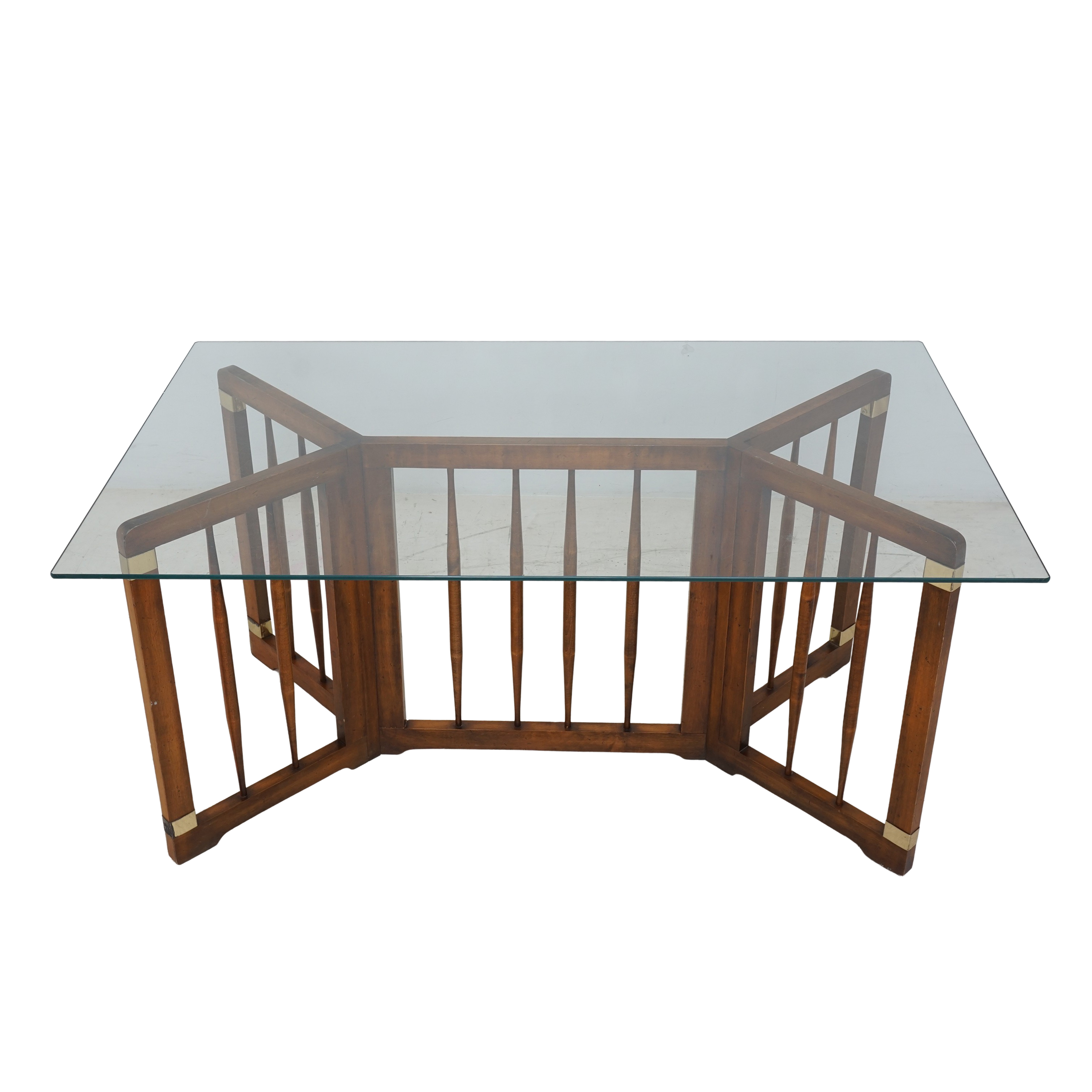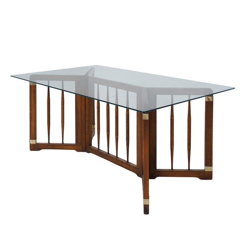 - Spindled wood, brass accents, glass top