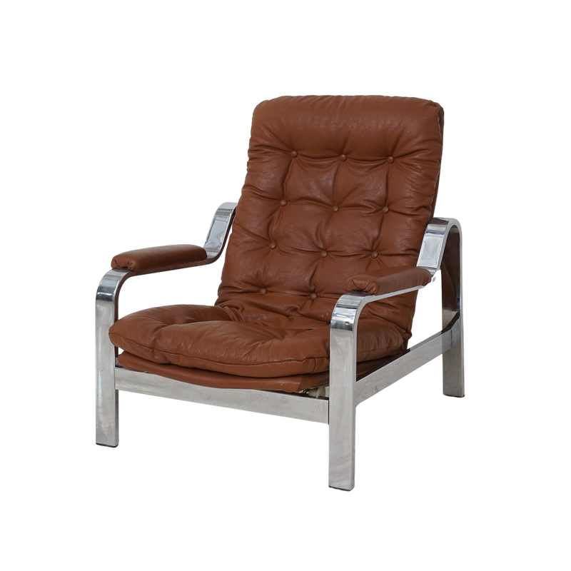 - Tufted brown vinyl upholstery, chrome-plated steel